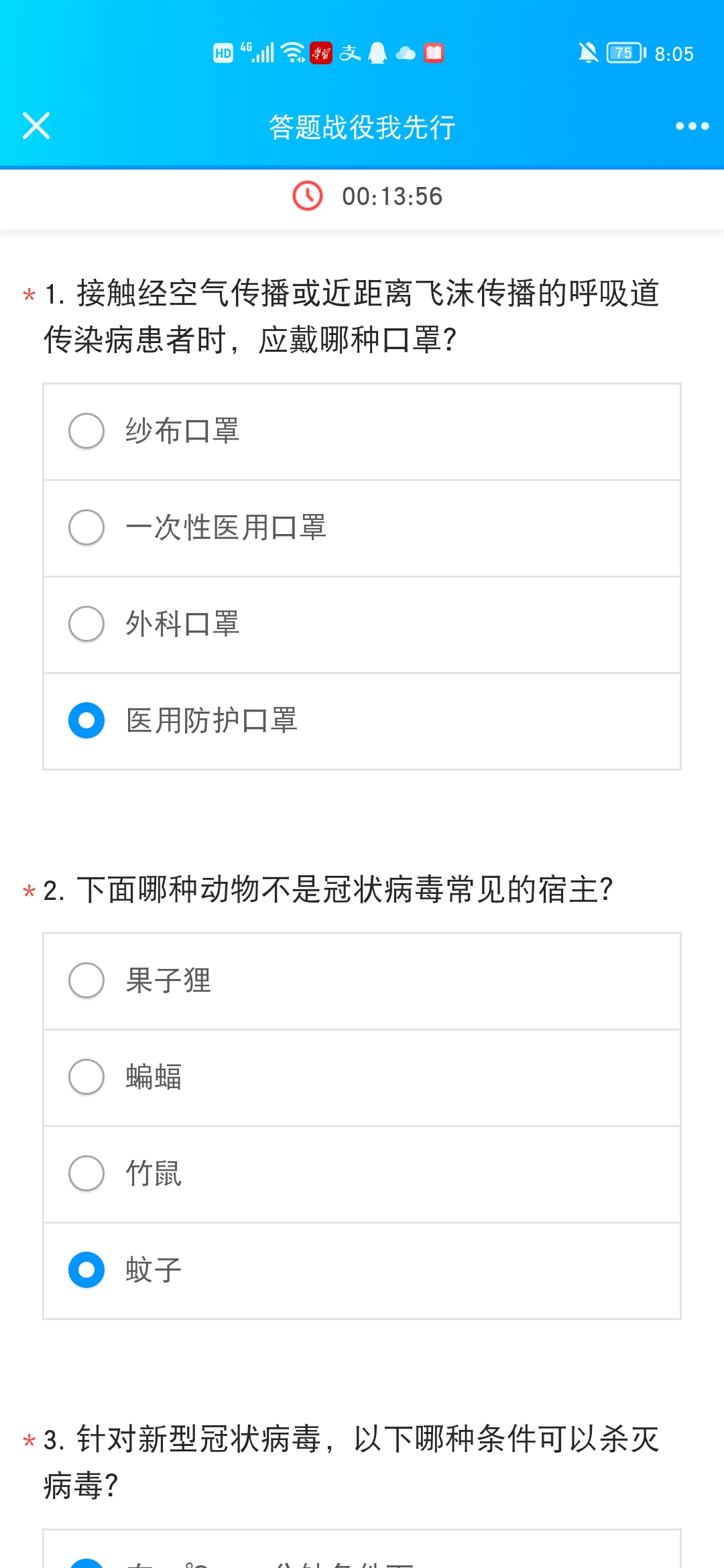 活动前期,同学们报名加入了“答题战役我先行”主题党日活动QQ群。活动开始,同学们扫码进入了问卷星进行答题,题型包括单选、多选、判断,共计25题。题目设置紧紧围绕“答题战役我先行”的主题,主要涉及口罩的正确佩戴方式、冠状病毒的常见宿主等多个方面。在答题过程中,同学们高度重视、诚信答题,无中途退出现象,也均在规定时间内完成了答题。通过核对大家的答题数据,最终评选出一等奖1人、二等奖2人、三等奖3人。