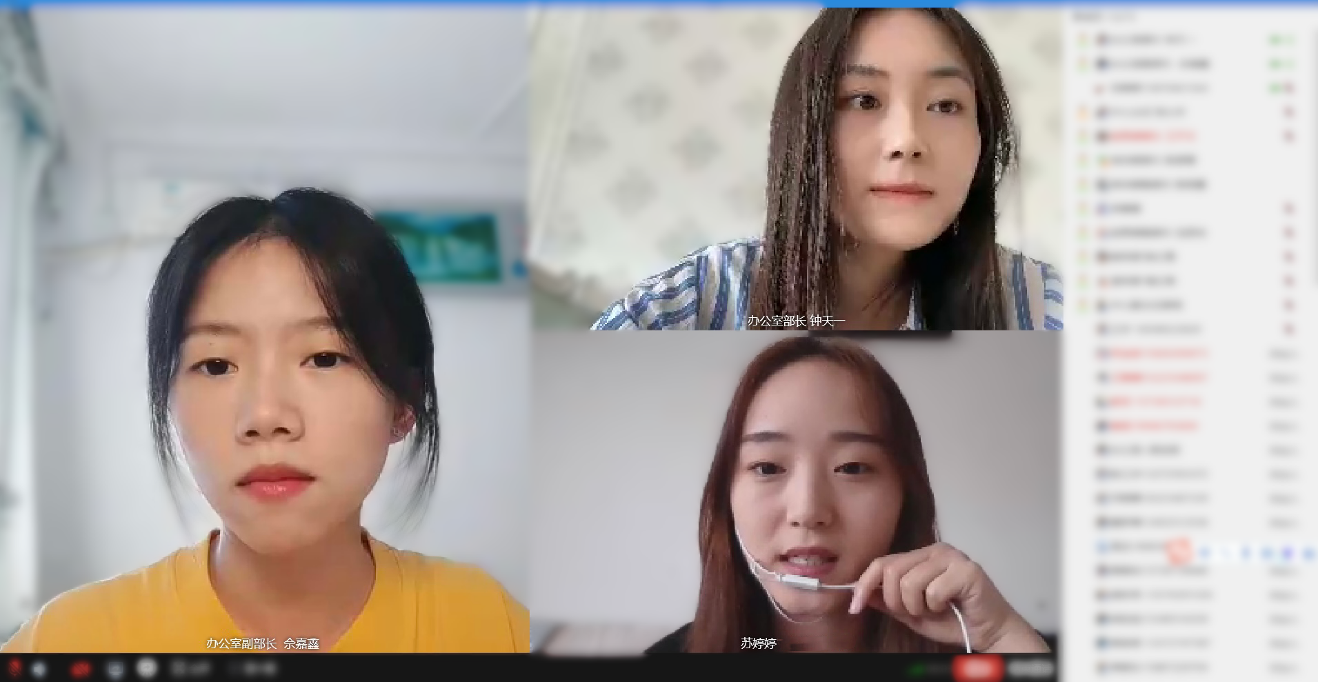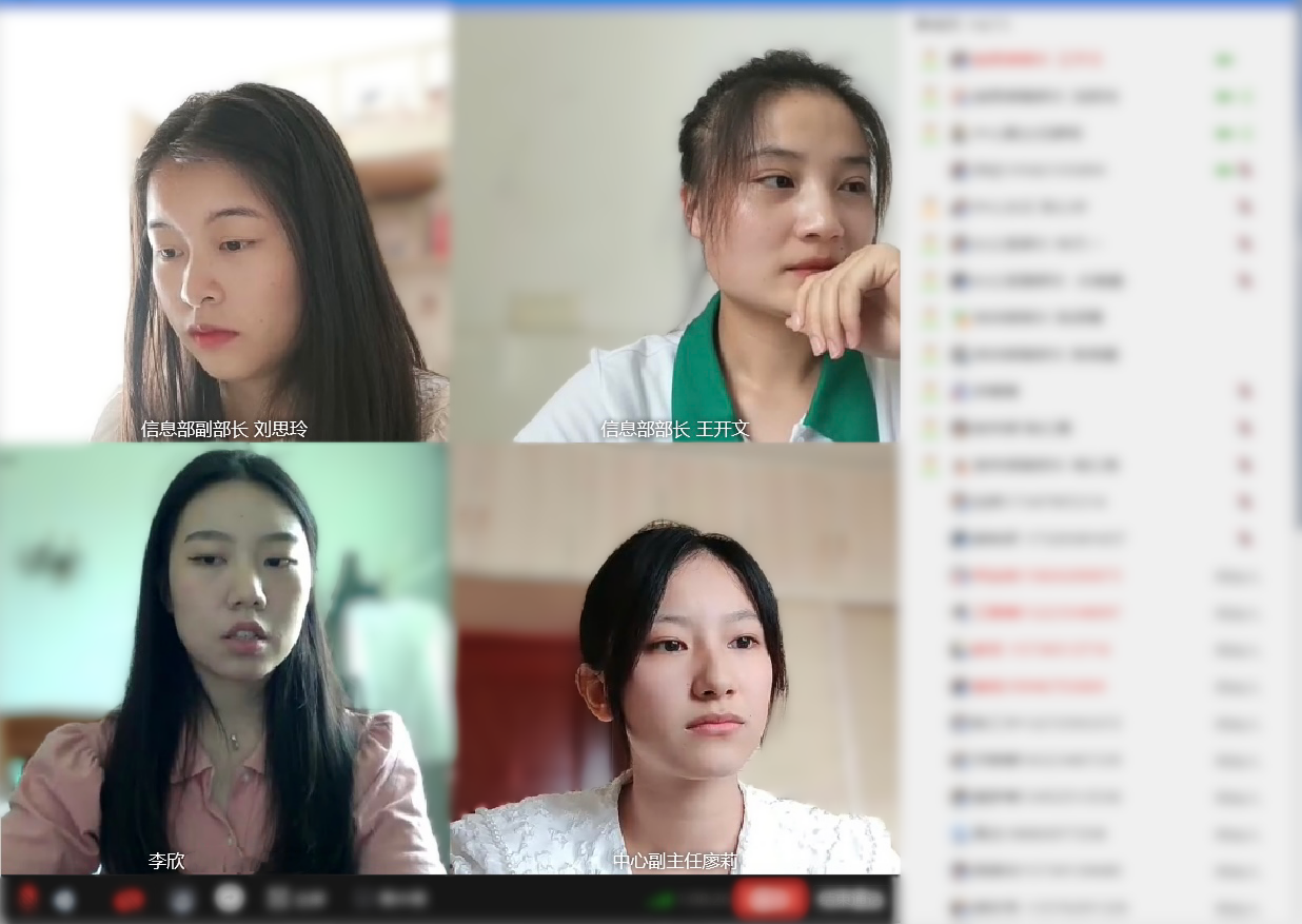 此次招新面试活动分为三个环节,分别是各竞聘同学进行自我介绍、面试官提问以及综合评价。面试正式开始,各竞聘同学井然有序地进入面试直播间,他们自信大方、谈吐从容、热情洋溢,展现出了管理学院学子积极勇敢的精神风貌。在问答环节,各竞聘同学纷纷表达了自己对所竞聘部门的向往以及自我的规划。荣老师和各学生负责人也对各竞聘同学的表现给予了肯定和建议,鼓励同学们保持初心和干劲儿,踏实求进,在中心绽放光彩!