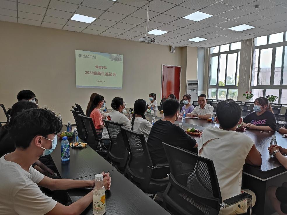 (文/图 办公室 荣菁菁)2022年9月19日,管理学院举行2022级新生座谈会,简玉刚院长与2022级新生代表亲切交流,倾听新生心声,畅通沟通渠道,启迪新生尽快适应大学生活。座谈会由22级工商3班李许铭同学主持。