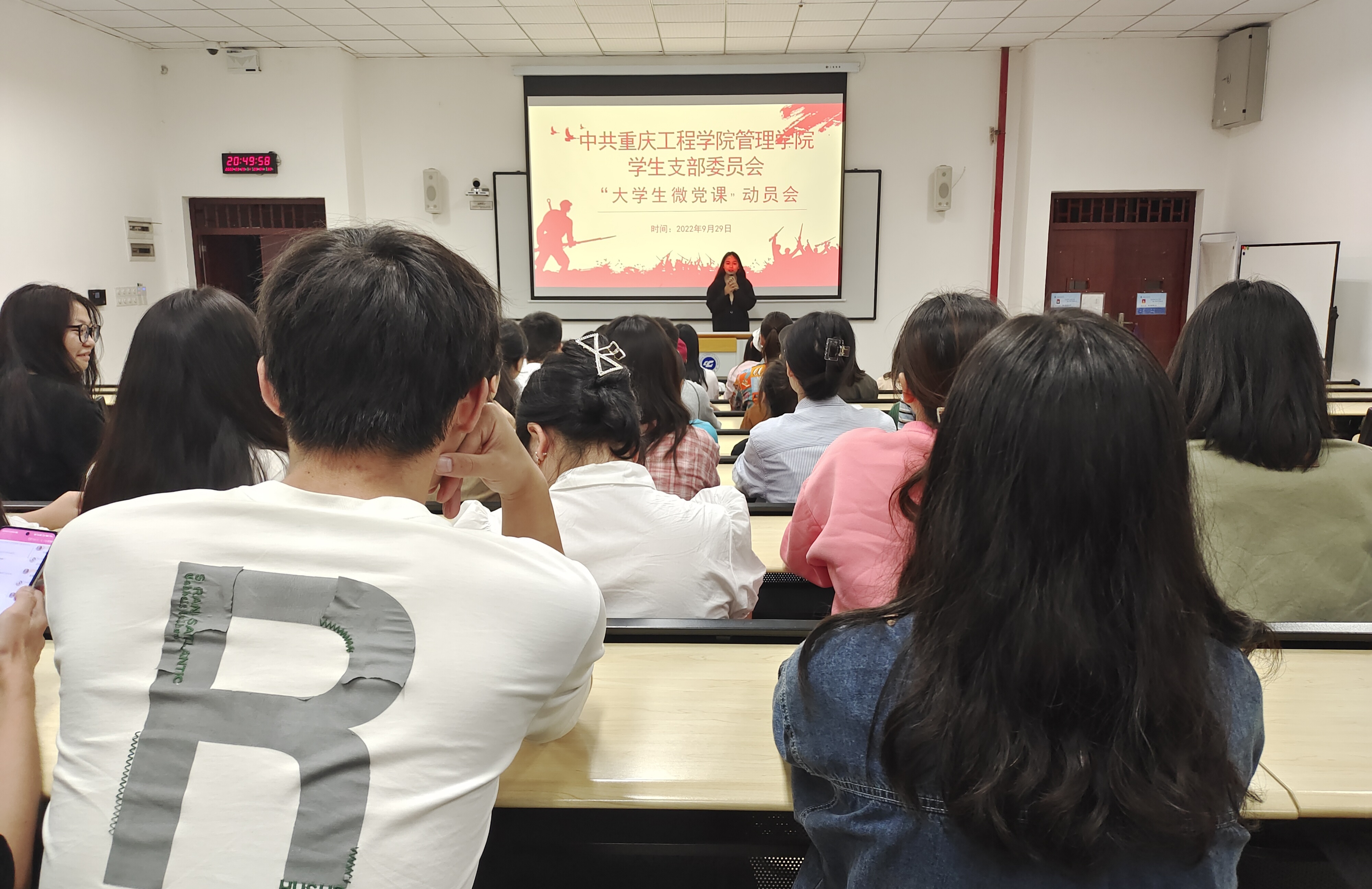 (文/图 学生党教中心 邹学微)为进一步搞好管理学院特色党建活动,用青年奋斗迎接党的二十大胜利召开,管理学院于2022年9月29日20:50在6204教室召开了“大学生微党课”进班级活动动员大会。本次会议由管理学院学生党员实践教育中心培训/实践部干事刘义莲主持,管理学院预备党员以及21级晨课助理共计61人参与。