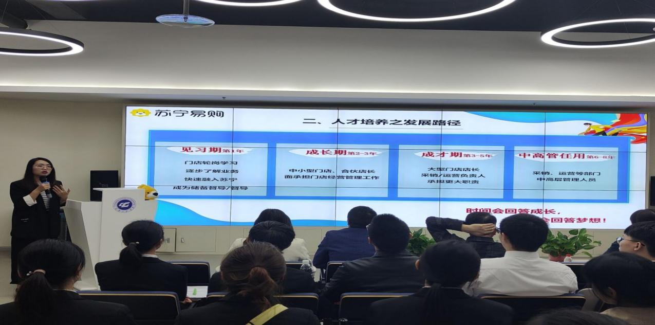 随后,黄总以“不负热爱,易往无前”为主题开始本次订单班宣讲,从公司介绍、人才培养之发展路径、“狮兄狮姐”的成长日记等几个方面引入,接着对招聘岗位、薪资待遇、晋升通道等进行了详细介绍,并强调苏宁需要的是有理想、有野心、有特长、爱学习,能够快速融入苏宁的同学。黄总鼓励同学们踊跃尝试、挑战自我,向学长学姐们学习,攀向更高的巅峰。