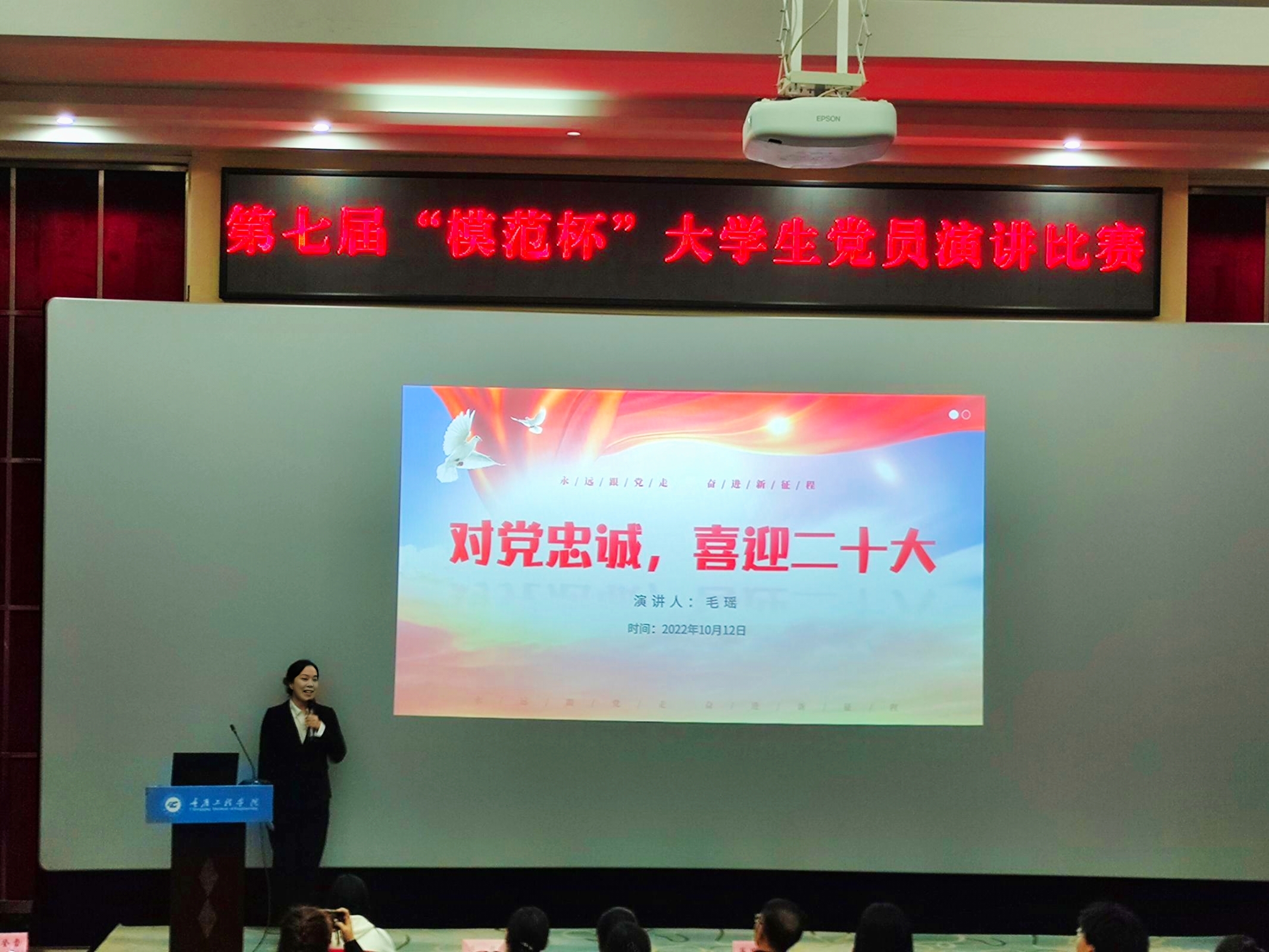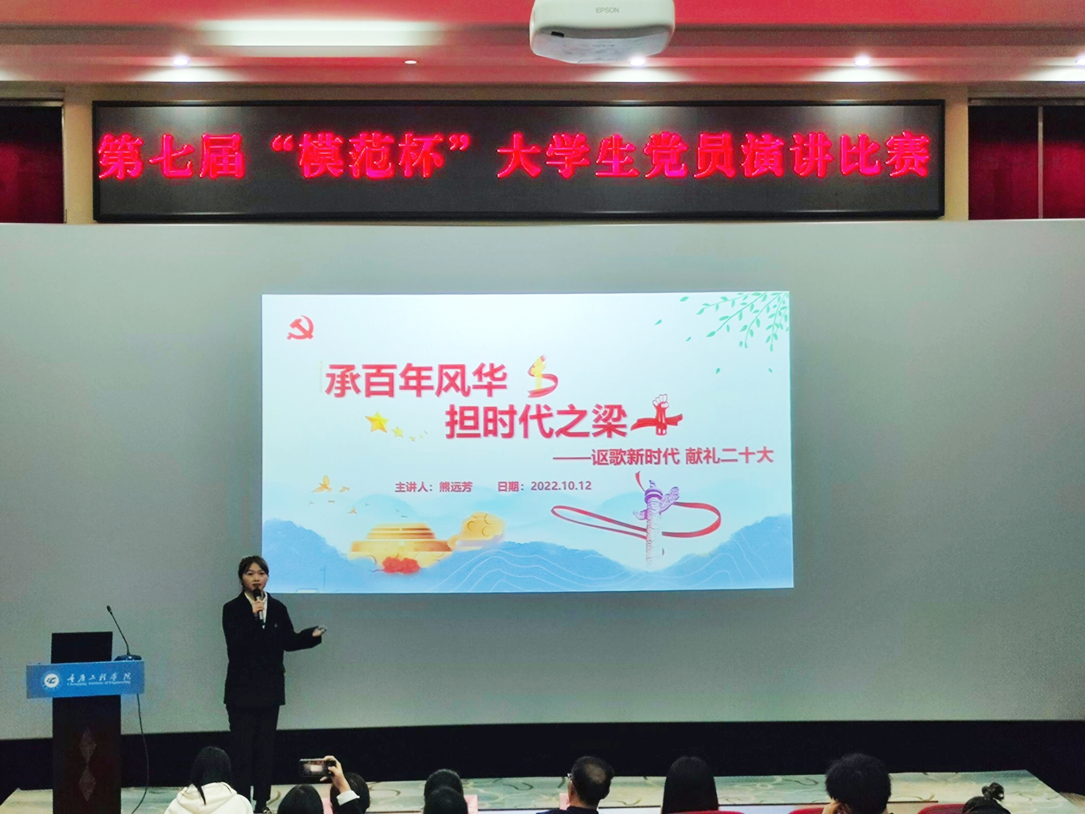 (文/图 学生党教中心 何金桧)为迎接党的二十大胜利召开,继承和发扬党的优良传统和作风,中共重庆工程学院委员会组织部于2022年10月12日15:30在阶梯报告厅举办了第七届“模范杯”大学生党员演讲比赛决赛。管理学院经过初赛选拔,最终选出毛瑶、熊远芳两名同学参加此次比赛决赛。
