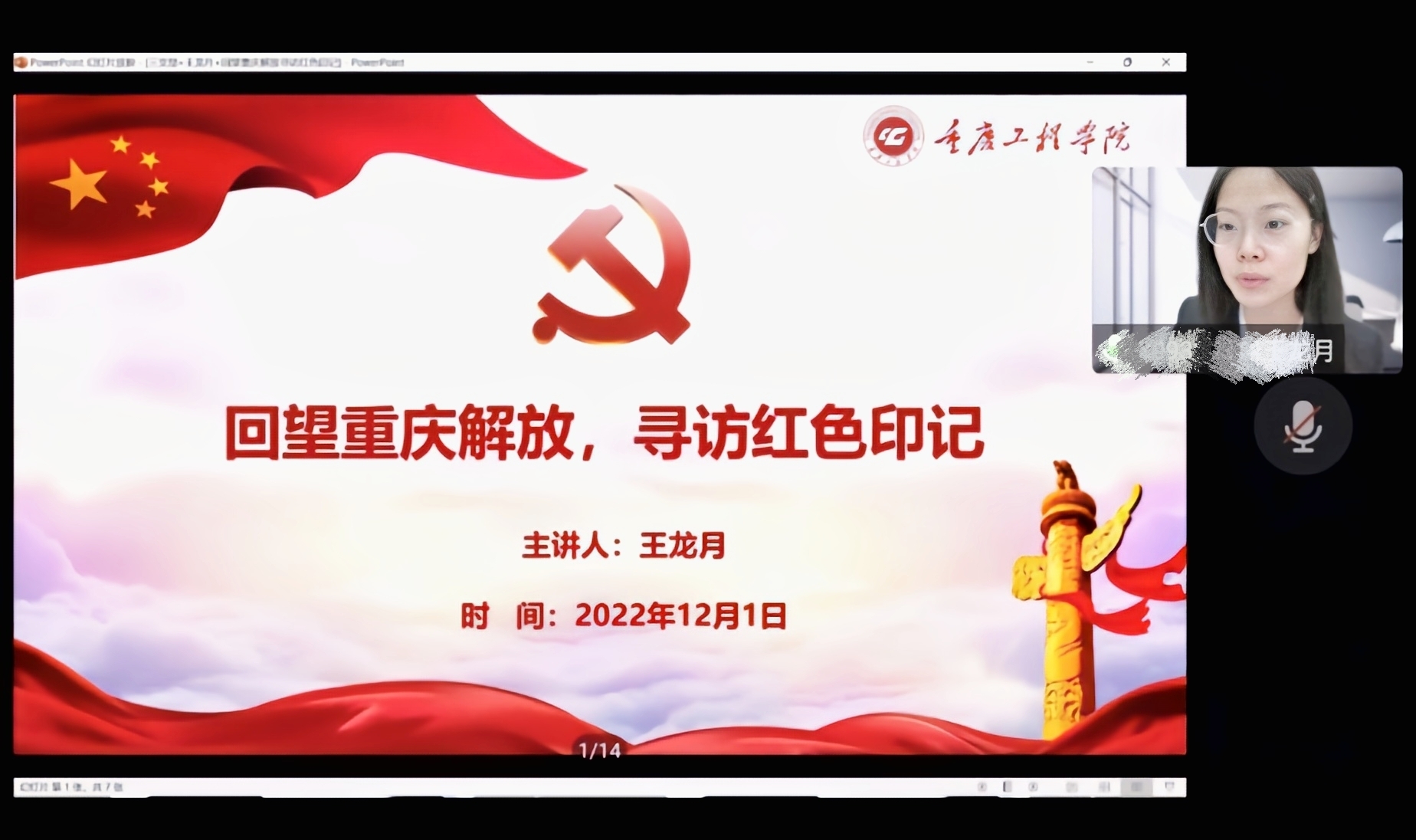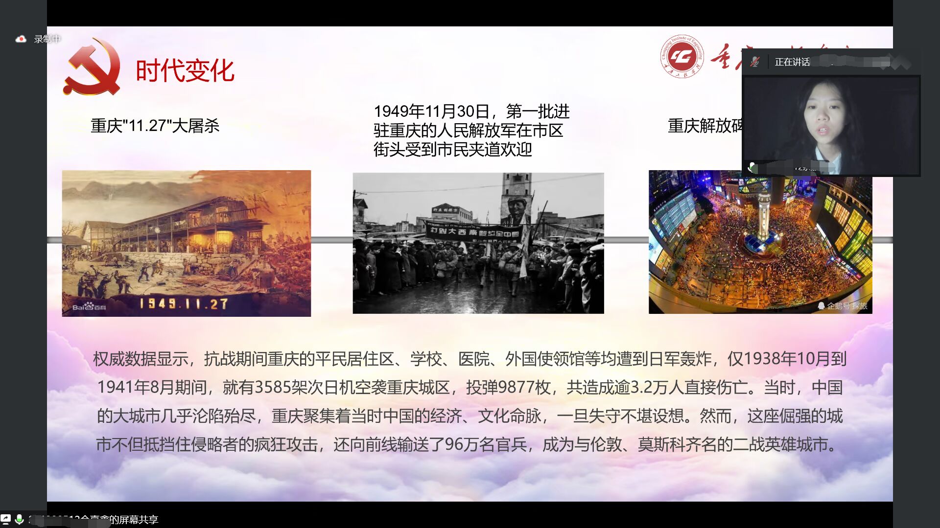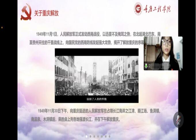 (文/图 学生党教中心 邹学微)不忘苦难记忆,砥砺复兴之志。为深刻学习领会重庆解放的重要意义,缅怀革命先烈,追忆革命历史,管理学院四个学生党支部于12月1日在线上开展了“大学生微党课”进班级活动。9名学生预备党员进入线上晨课课堂,向2021级同学们进行了“重庆解放:自由的呐喊”主题宣讲。