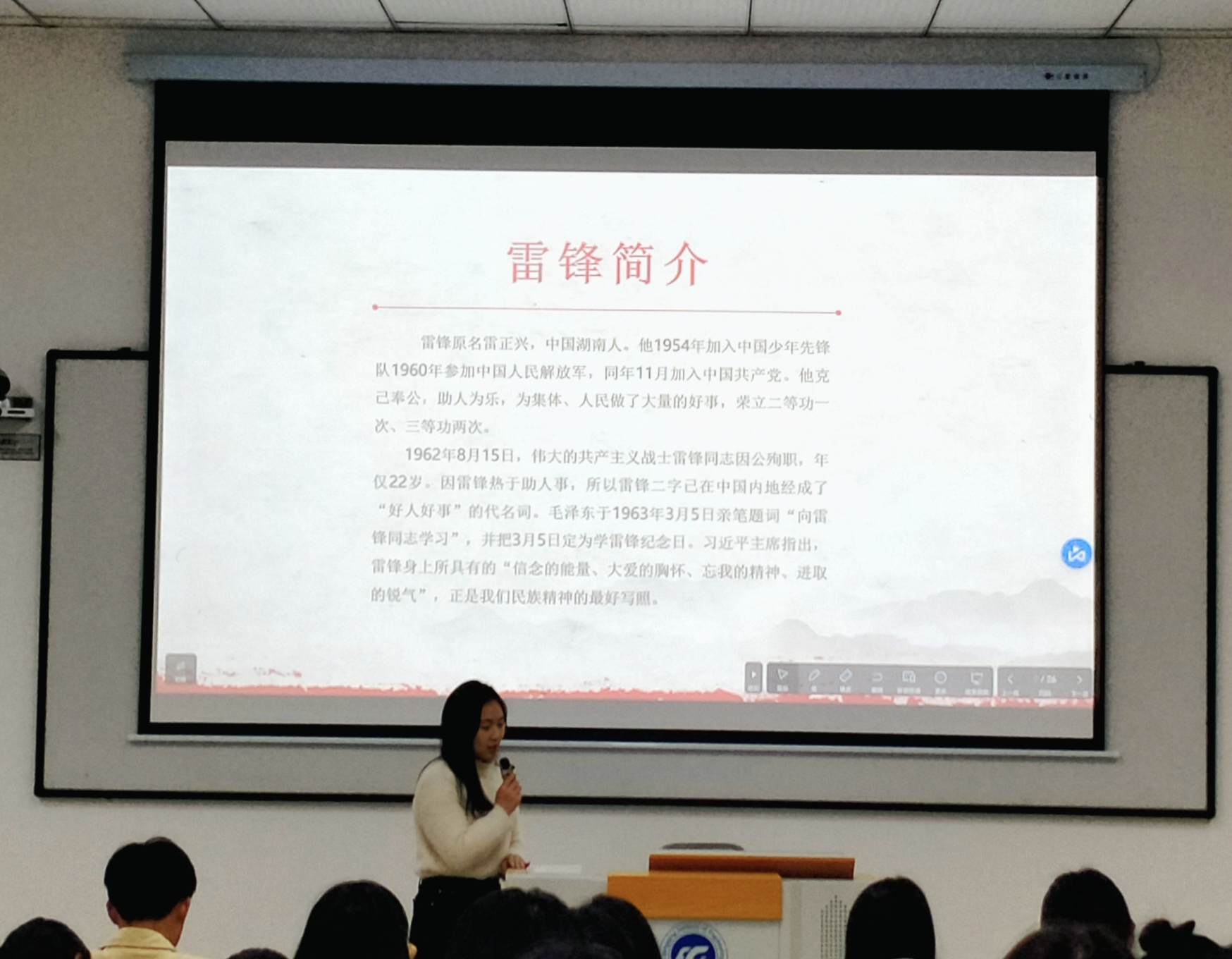 活动开始,余婷同学以“学习雷锋精神,争当文明先锋”为主题,分享了雷锋精神的时代内涵、具体内容以及如何发扬雷锋精神,表示作为新时代的青年须把崇高理想信念与道德品质追求转化为具体行动。接着,宋姗姗同学讲解了雷锋同志的生平故事和雷锋精神的时代性,并联系重工青年志愿者践行雷锋精神的具体活动,呼吁同学们积极参与校内外各种志愿服务,在实践中追随雷锋的脚步,发扬艰苦奋斗的精神。最后的时事热点分享环节,同学们踊跃参与,发表看法、积极讨论,抒发自己的所思所想。