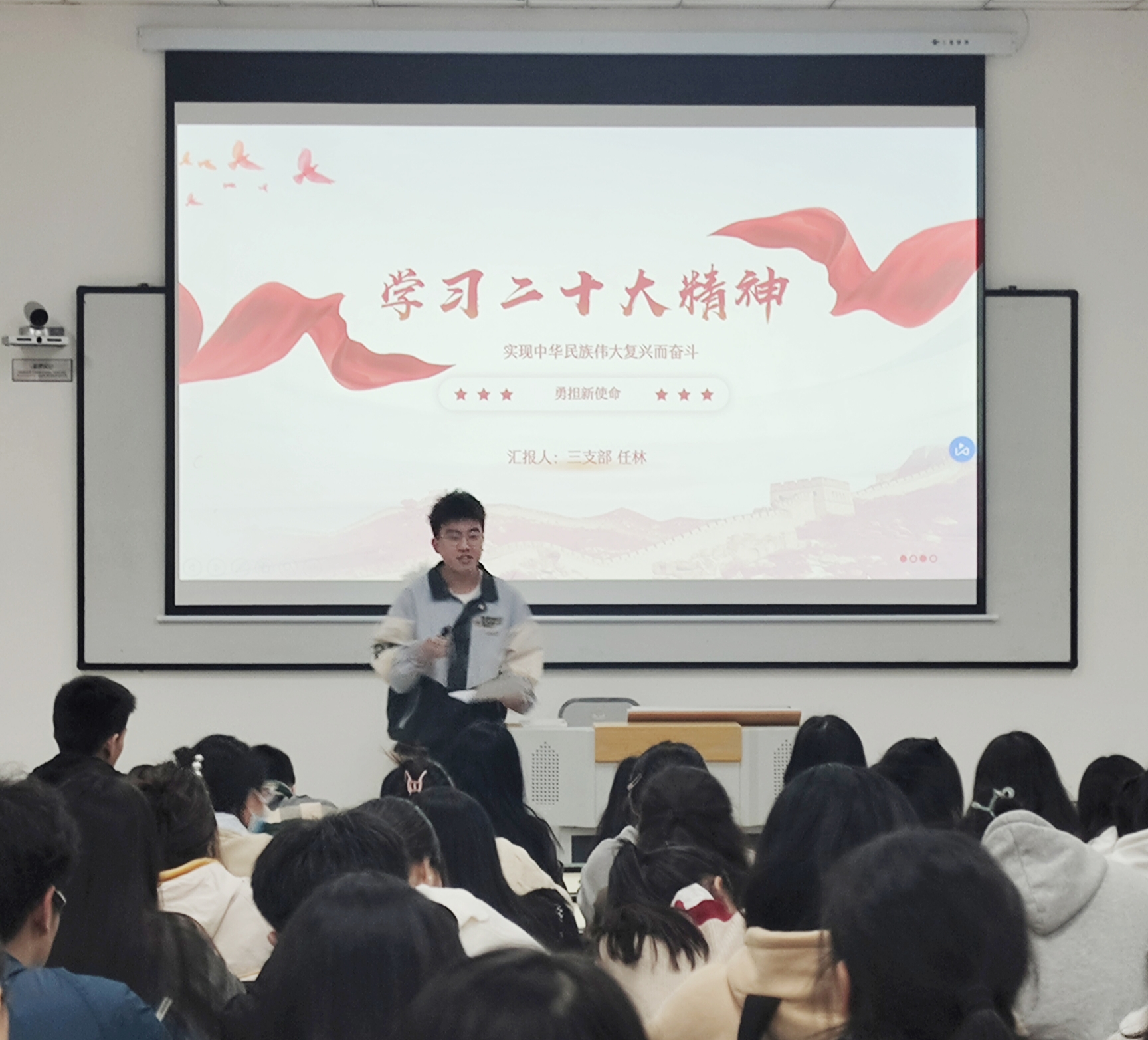 活动伊始,任林同学从党的二十大报告的主要结构出发,详细阐述了党的使命任务,同时告诫同学们要以谦虚谨慎的态度,以敢于斗争、善于斗争的精神投入到新时代祖国发展建设的艰苦奋斗中去,争做“四讲四有”合格党员。接着,邓宇同学分享了党的百年奋斗发展历程,并激励同学们以史为鉴、开创未来。百年来,党团结带领人民书写了中华民族几千年历史上最恢宏的史诗,使中华民族伟大复兴展现出前所未有的光明前景。最后的时事热点分享环节,同学们踊跃参与,结合当下热点,发表自己的看法与感悟。