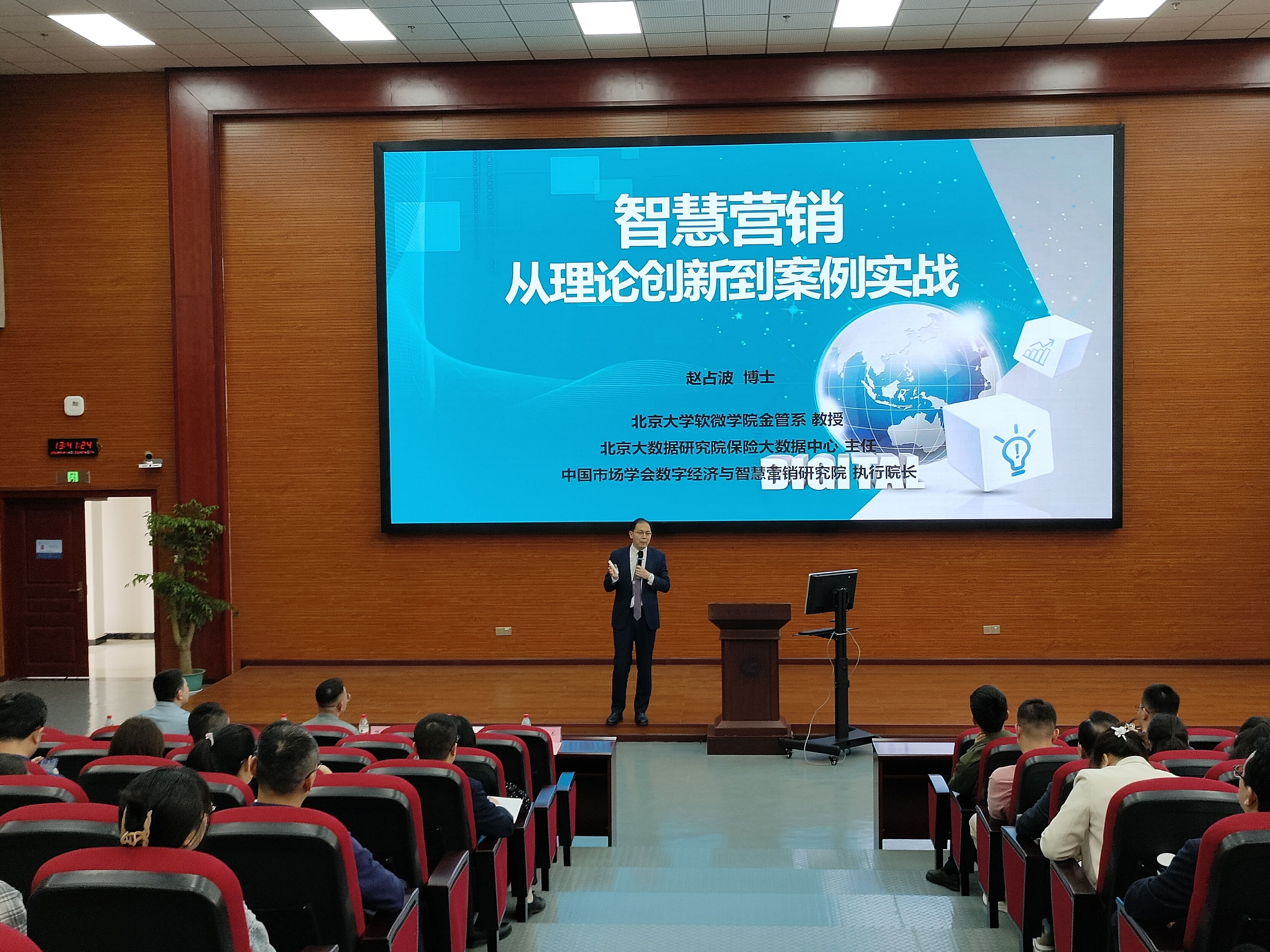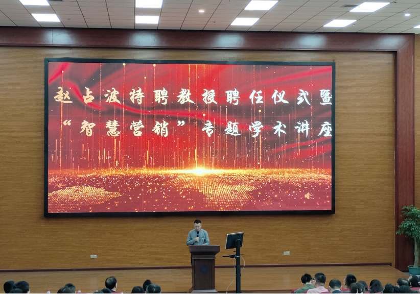 接着,赵占波教授进行了主题为“智慧营销:从理论创新到案例实战”的学术讲座。赵教授从国家政策导向、营销创新机遇与挑战、营销理论的发展与演变、智慧营销的内涵、模型等方面给大家做了讲解,既有理论高度,又有很强的现实性和指导性。讲座内容生动、深入浅出,引起了老师和同学们的广泛共鸣,现场气氛热烈,掌声不断。