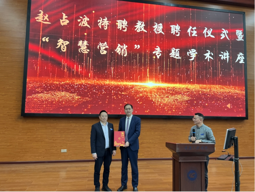 为适应时代发展,培养具备智慧营销思维的应用型人才,2023年4月14日,管理学院在7教807学术报告厅举办了赵占波特聘教授聘任仪式暨“智慧营销:从理论创新到案例实战”学术讲座。北京大学软微学院赵占波、重庆工程学院党委书记谭明术、管理学院院长简玉刚、副院长徐先航等出席了会议,管理学院全体教师和2020级、2021级市场营销及电子商务专业的学生参加了本次讲座,会议由管理学院院长简玉刚主持。