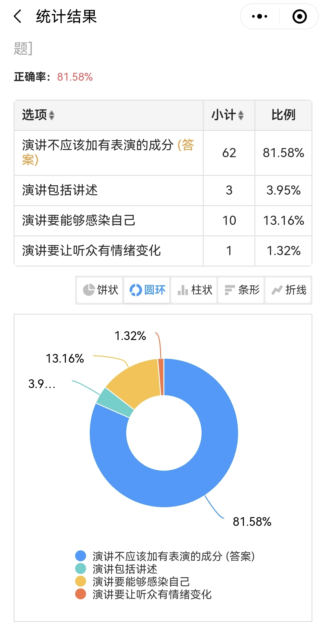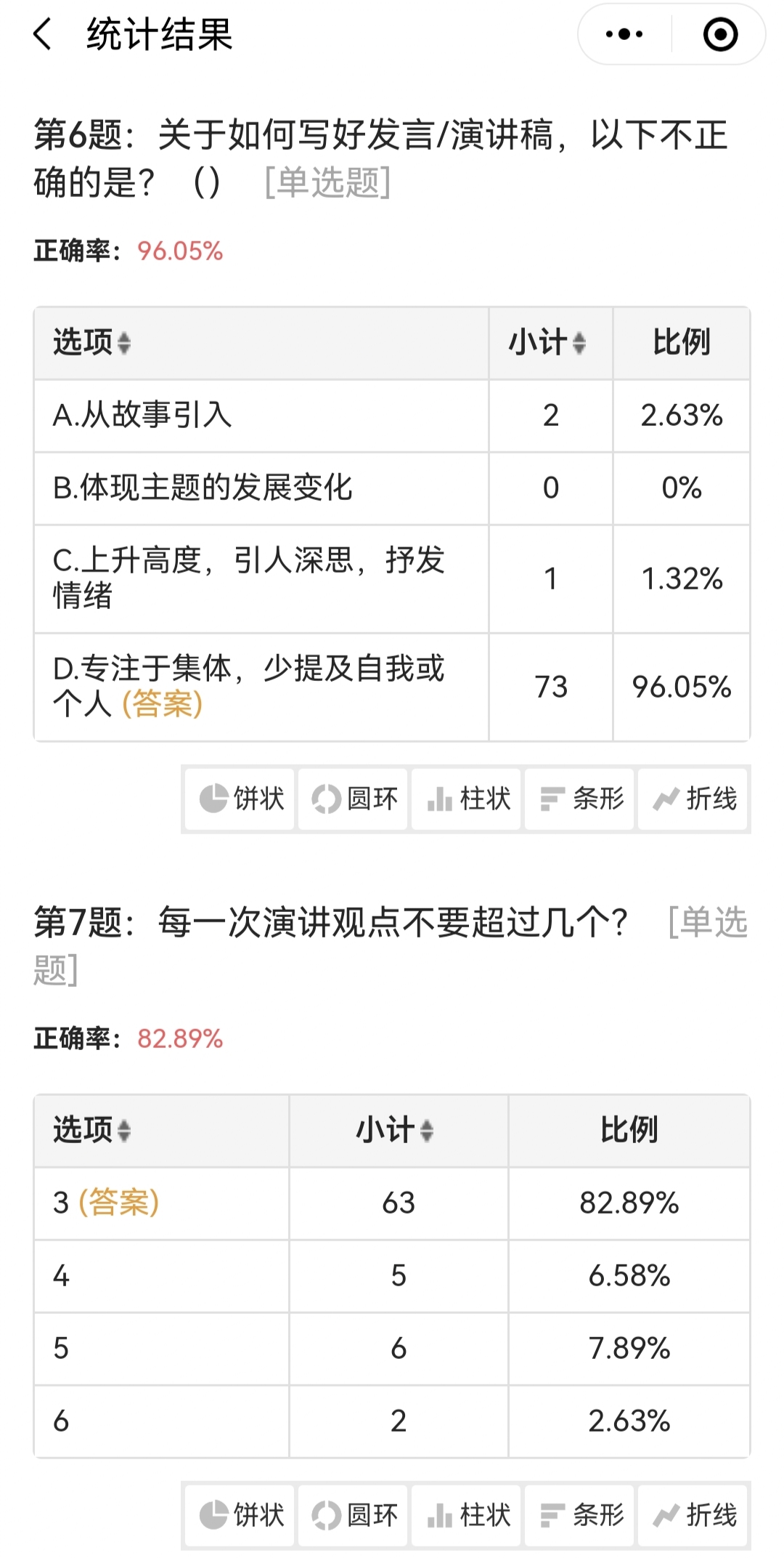 本次活动根据演讲的准备、内容、表达等方面进行出题,主要分为单选题和多选题两部分。其内容涵盖演讲前的准备工作、演讲内容的逻辑性和连贯性、在演讲过程中声音的抑扬顿挫和语调的变化以及肢体语言的运用。同学们积极参与,在规定的时间内较好地完成了竞答,答题的过程不仅是学习的过程,更是一次深刻的宣讲知识教育。答题结束后,同学们纷纷表示要将此次学习到的知识运用到实际的演讲过程中,以便更好地提升自己的演讲水平。