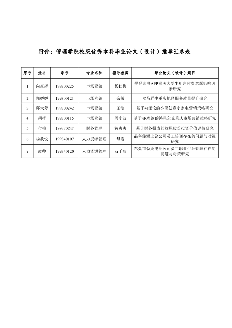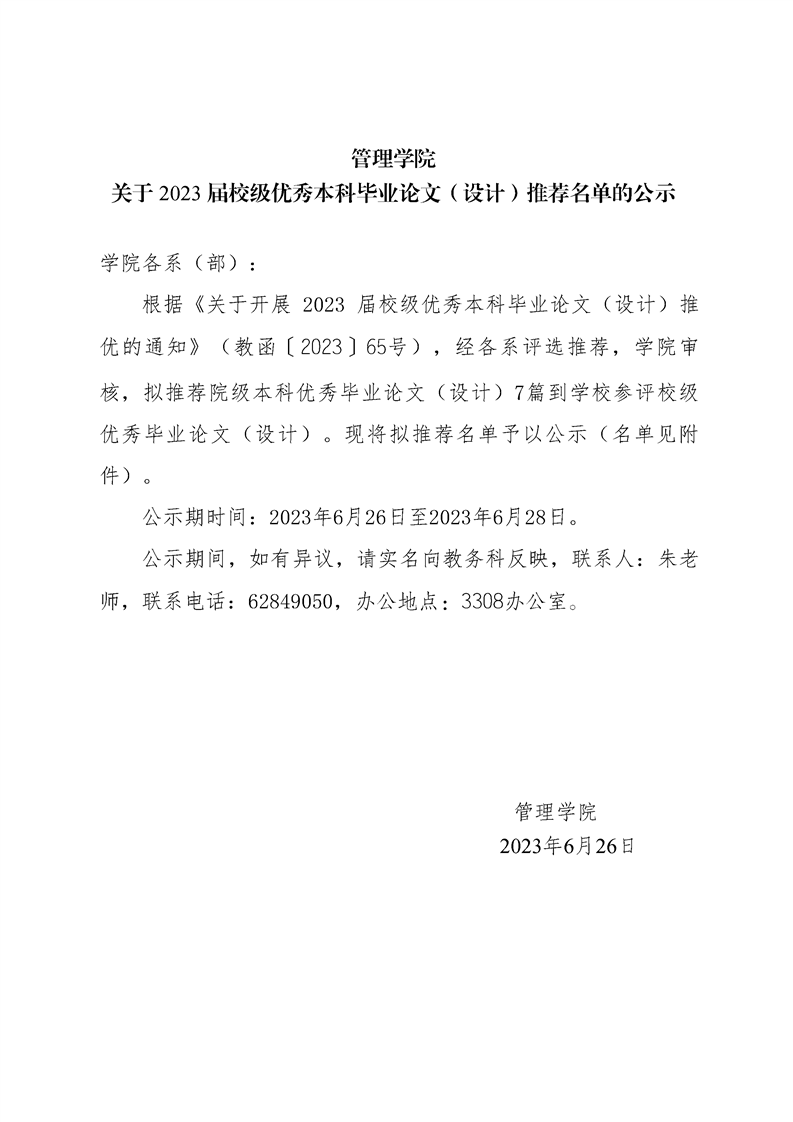 管理学院关于2023届校级优秀毕业设计(论文)推荐名单的公示