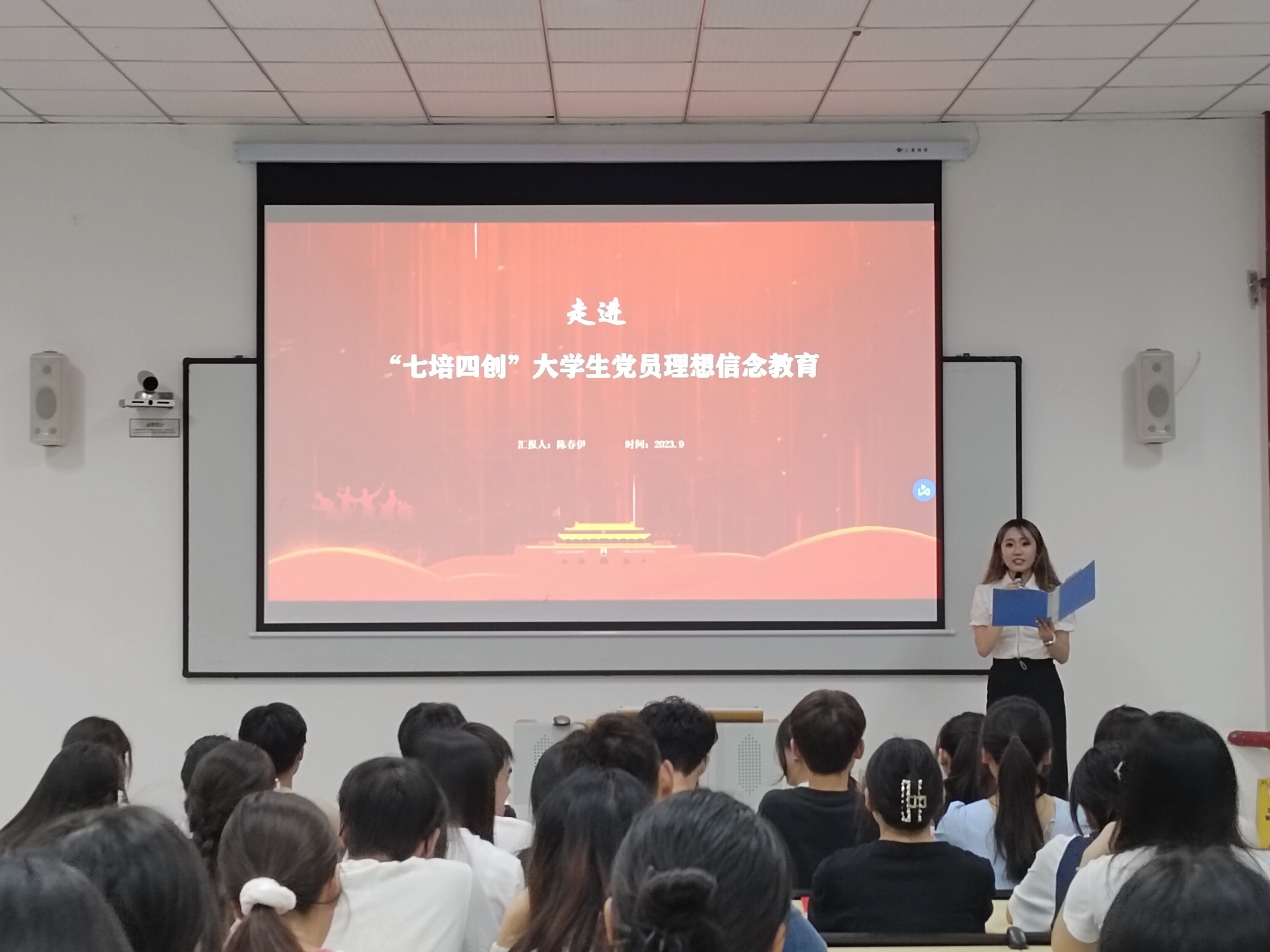 “启事在教诲,成事在榜样”。活动最后,优秀学生党员代表陈邵珊进行了学习感悟分享。她讲述自己过去两年一共参加了四十余次“七培四创”大学生党员理想信念教育,从一位旁观者、工作者到参与者,不管是工作经验还是学习经历都让她收获颇多;她鼓励同学们积极参加“七培四创”大学生党员理想信念教育,在学习中储备知识、在实践中锤炼本领,同时号召同学们要铭记历史,勿忘“九一八”,追思先烈、珍爱和平,以青春之我,担时代之责。