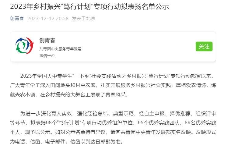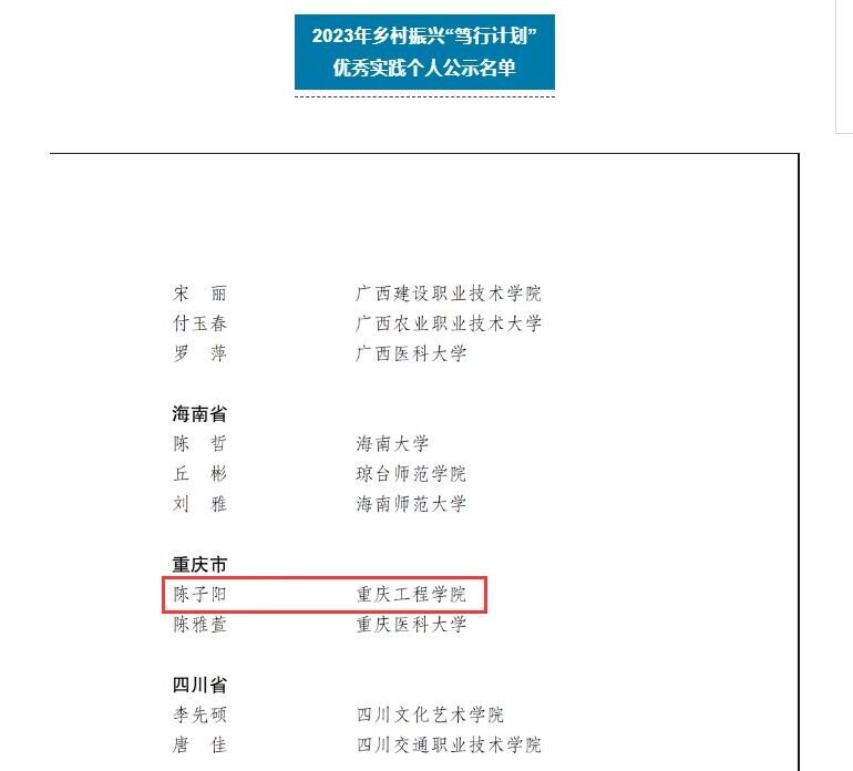 (文/图 学生科 王燕楠)12月12日,2023年全国乡村振兴“笃行计划”专项行动表扬名单公示,管理学院电子商务专业学生陈子阳荣获优秀实践个人。本活动全国共评选89名优秀个人,重庆市仅有2人获评。