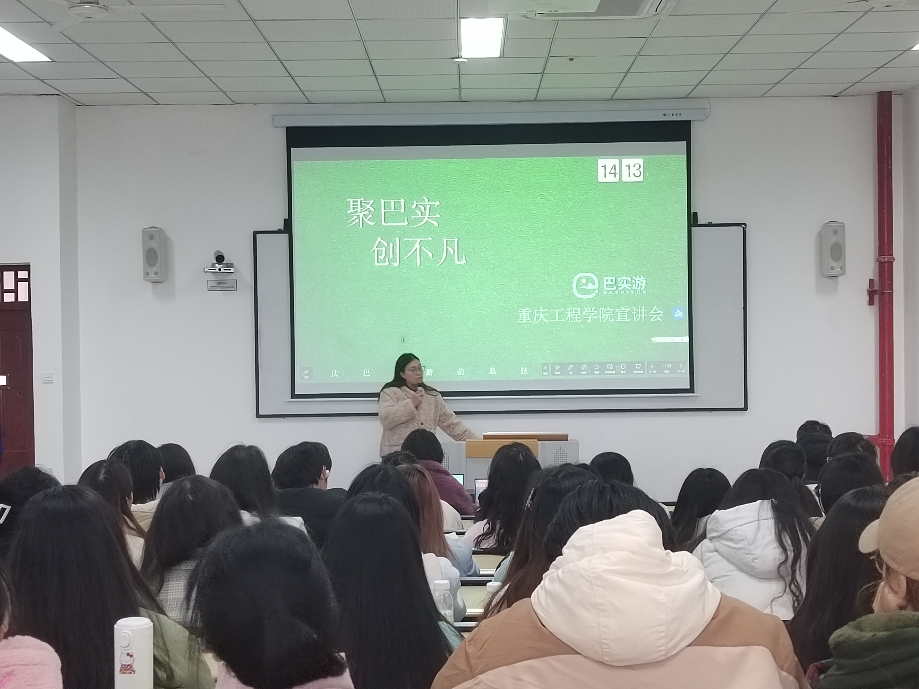 活动伊始,重庆巴实游信息技术有限公司老师向同学们进行了“聚巴实,创不凡”主题宣讲,介绍了重庆巴实游信息技术有限公司的发展目标。公司本着稳增长、促消费、助力乡村振兴的使命,把构建地区性多业态深度融合的生态服务体系作为经营目标,立足巴南,逐渐实现与主城各区联动,并向大重庆区域辐射,未来向国内其他地区复制推广“巴实游模式”,打造全国乡村振兴新典范。此次来的目的是推动研学旅行进校园,在区政府的指导下,公司通过打造巴南区研学大数据平台,助推大学生加入研学活动,实现旅游研学进乡村,这不仅有助于传播农业文明,更助推了乡村经济发展,实现文旅融合发展。宣讲老师号召大家积极参与素质研学活动,充分发挥同学们的先锋模范作用和社会责任感;同学们也积极响应号召踊跃报名。在活动最后,为更好地选拔人才,宣讲老师对同学们进行了测试,以此来检测同学们对基础知识的掌握。