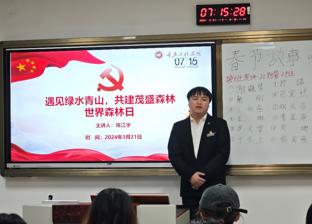 (文/图 学生党教中心 方蓓蕾)绿水青山,是大自然的馈赠,更是生命的摇篮。为倡导大学生尊重自然、顺应自然、把握自然规律,结合学院七培四创大学生理想信念教育方案,管理学院党总支于3月21日在第六教学楼开展“大学生微党课”进班级活动。6名学生预备党员走进晨课教室,向2022级同学们进行“遇见绿水青山,共建茂盛森林—世界森林日”主题宣讲。