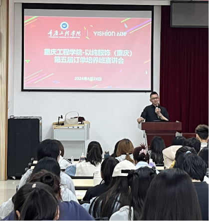 (文/图 就业科 张中义)为加强校企合作,拓宽就业渠道,4月24日下午,学院在6302报告厅举行“重庆工程学院-以纯服饰第五届订单培养班”宣讲会。本次会议由数字营销系主任余敏主持,以纯服饰重庆办事处总经理扈晓、HR经理李艳、管理学院院长简玉刚、就业科副科长张中义、辅导员赵慧慧和罗雪老师,以及21级市场营销专业250余名同学参加。
