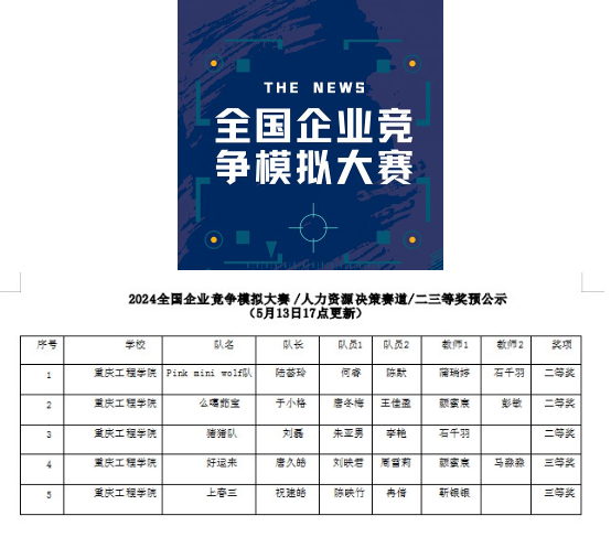 (文/图 人力资源系 颜蜜宸)近日,全国企业竞争模拟大赛(国家级学科竞赛)公布《关于全国企业竞争模拟大赛-人力资源决策赛道获奖名单公示》,我院人力资源管理系师生在大赛中勇于拼搏、赛出风采,共有5个比赛团队成功入围全国赛,最终取得全国二等奖3项、全国三等奖2项,为我院专业技能竞赛榜单又增添了一抹亮色。本次大赛有效地检验了我校实践教学的成果,展示了我校应用型人才培养的显著效果。
