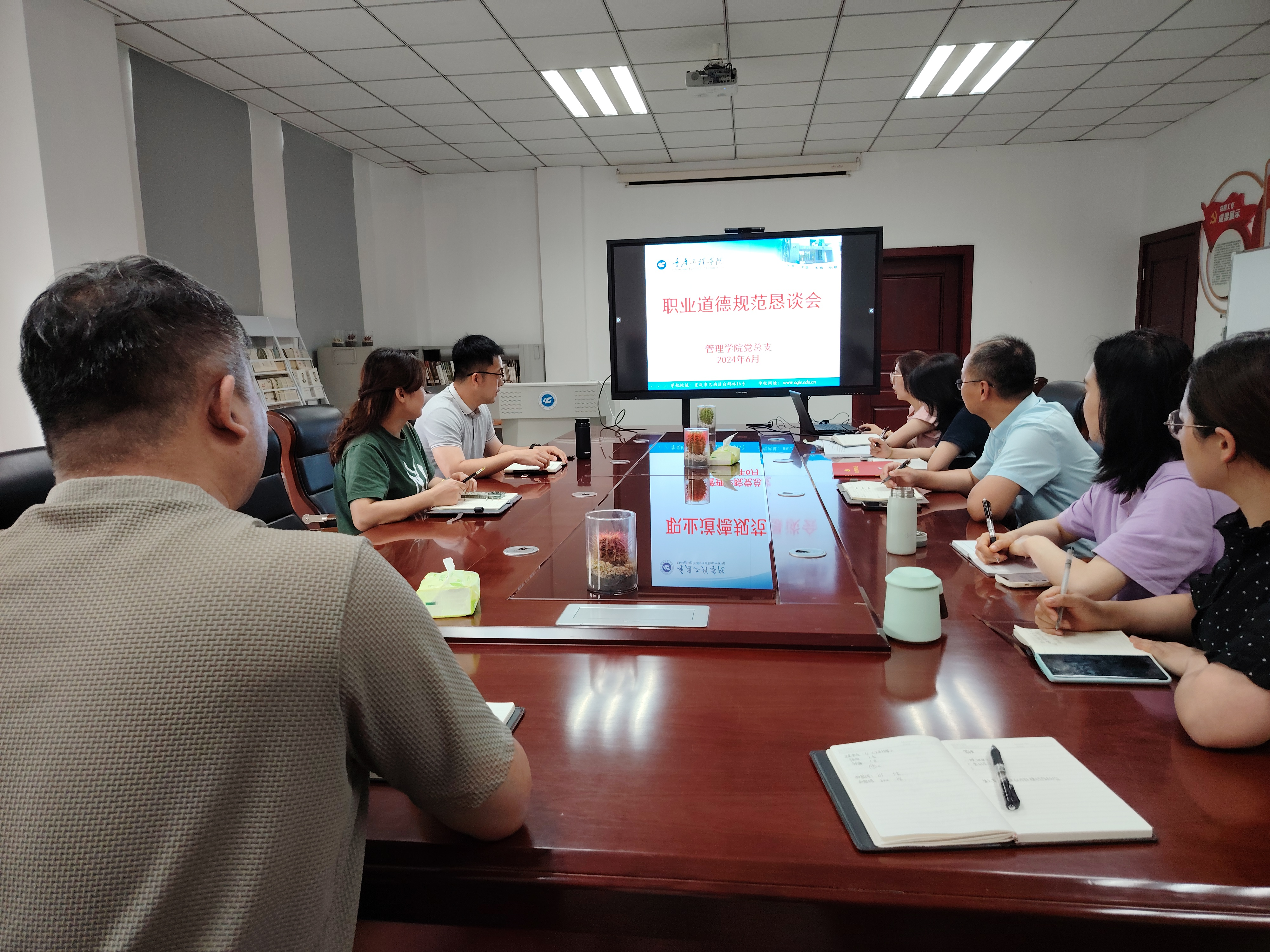 (文/图 办公室 朱露)为进一步加强学院师德师风建设,6月13日下午, 管理学院党总支书记尚伟主持召开了职业道德规范恳谈会,充分听取了部分教师对当前学校师德师风状况、存在的差距和如何加强师德师风建设三个方面的意见和建议。