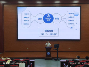 学院党总支书记尚伟发表了讲话。尚书记以包容,和谐为主题,介绍了学生社区建设的重要性。尚书记强调,寝室是学生日常生活和学习的重要场所,寝室长作为学生管理工作的基层骨干,承担着维护寝室秩序、促进寝室文化建设的重要职责。他希望寝室长们能够以身作则,积极履行职责,发挥模范带头作用,共同营造一个温馨、安全、和谐的住宿环境。