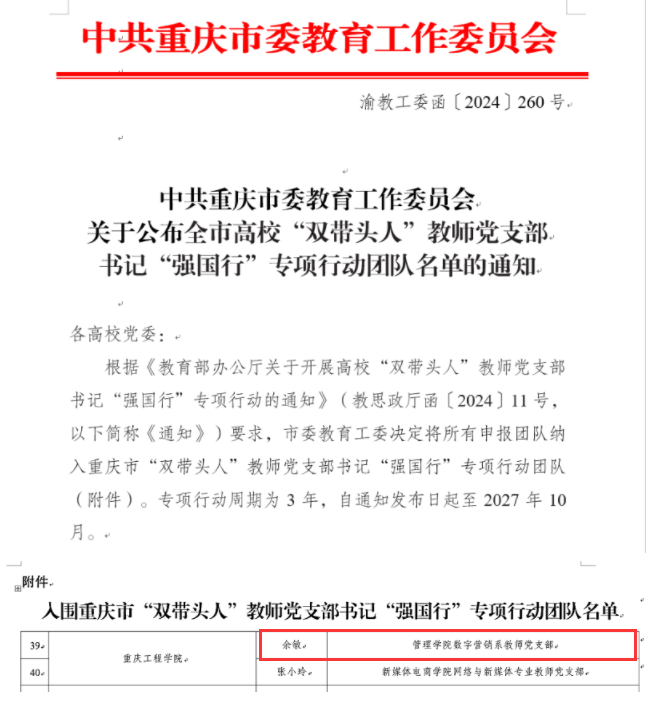 本网讯(图/朱露 文/朱露)近日,我院数字营销系教师党支部入选重庆市高校“双带头人”教师党支部书记“强国行”专项行动,这一成就不仅标志着我院教师党建工作迈上了新的台阶,更为我们进一步融合基层组织党建工作与业务工作提供了宝贵的机遇。