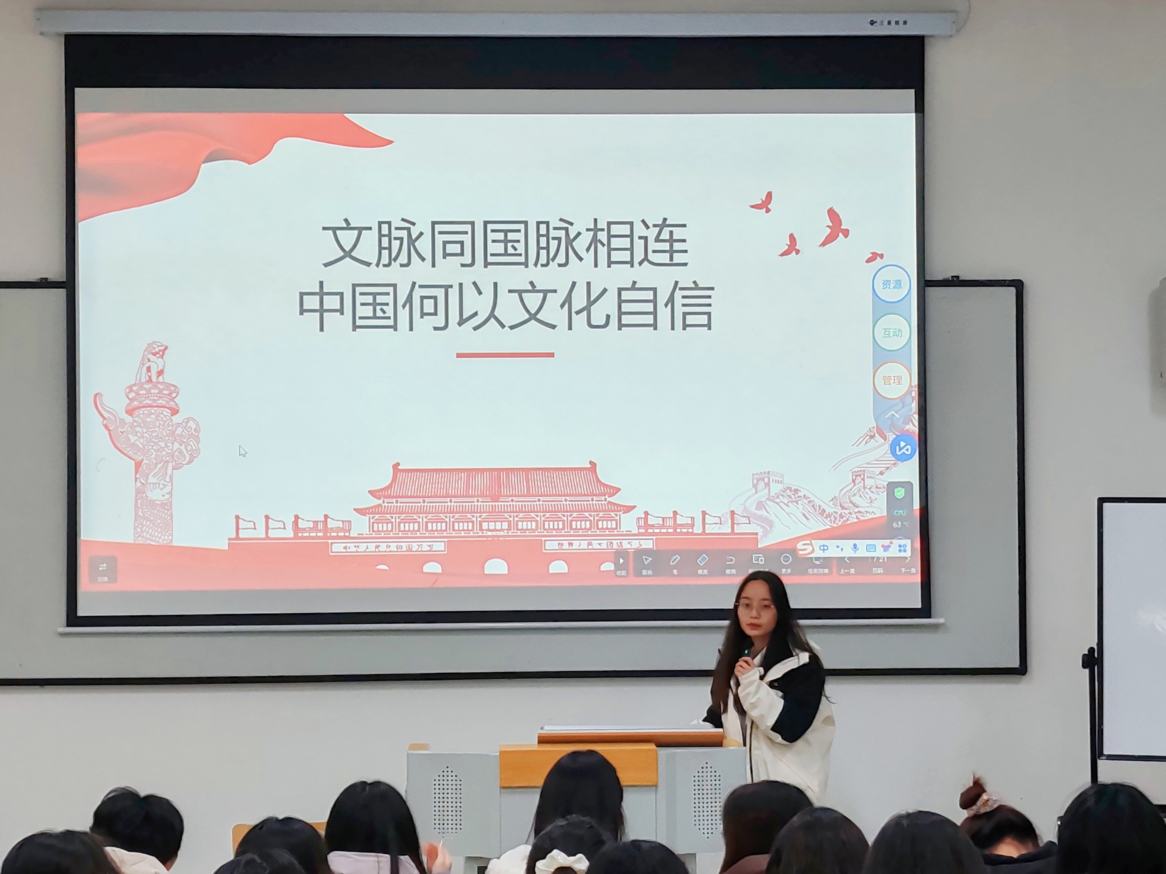 活动伊始,漆琪同学通过故宫文创作品火爆热卖现象引入主题,通过一系列的案例向我们展示了中国何以文化自信,同时深入剖析了文化自信的价值引领作用。紧接着,王晓琳同学详细介绍了什么是民族精神和民族精神的作用,强调了弘扬民族精神的重要性并为如何传承民族精神提供了详细方案。