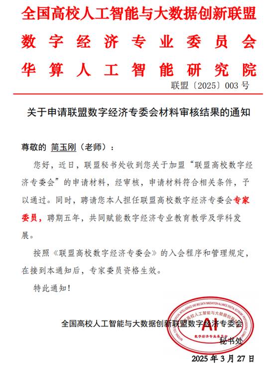 (文/图 管理学院 朱露) 近日,全国高校人工智能与大数据创新联盟数字经济专委会公布了联盟数字经济专委会评审结果,管理学院院长简玉刚受聘联盟数字经济专委会专家委员,聘期五年。