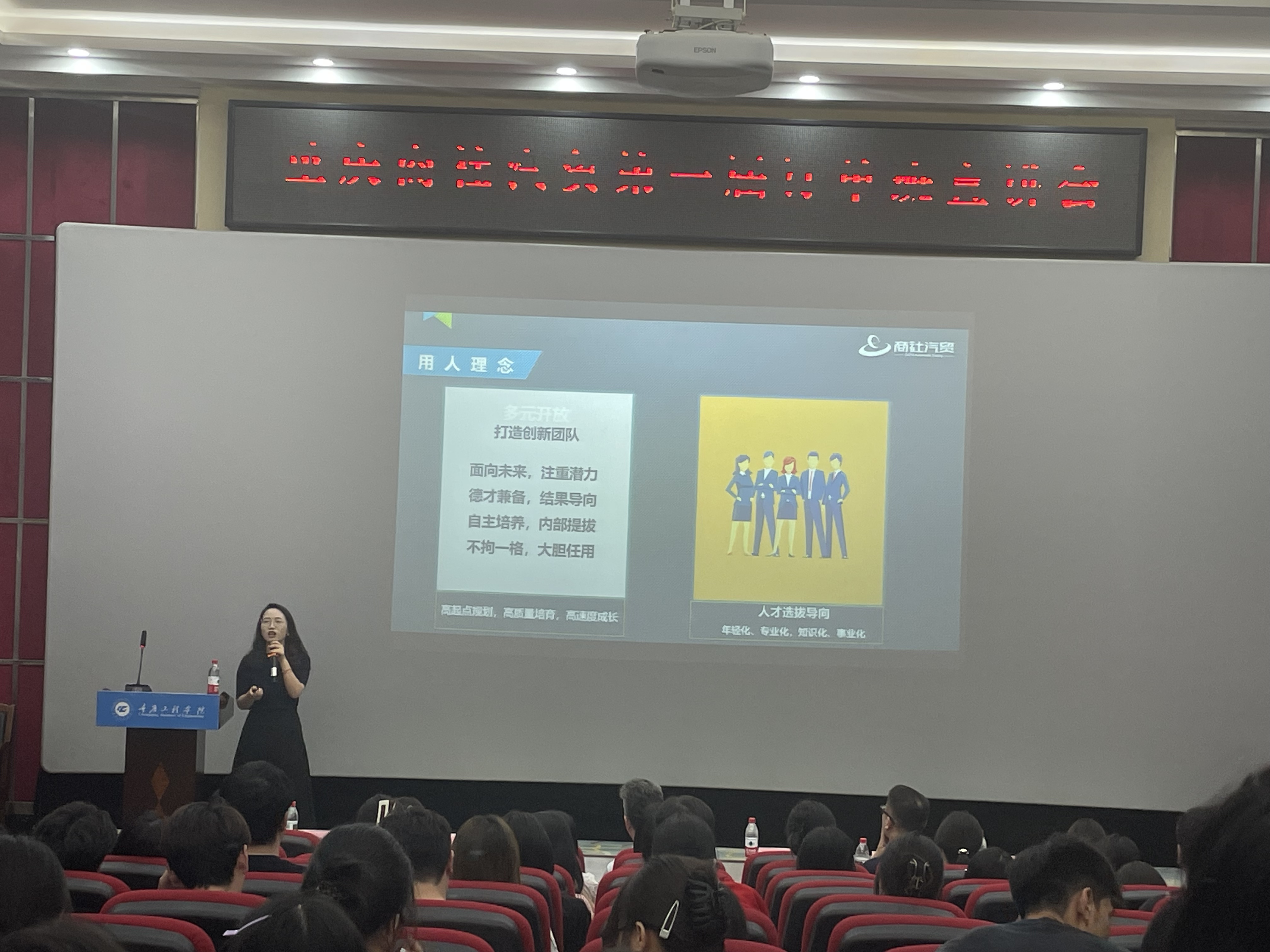 该公司综合部总经理杨荣卿详细介绍了企业的发展历程、企业文化、组织架构及行业发展趋势,并引用名人名言,鼓励同学们将理论知识转化为实践能力,积极行动起来。人力资源总监黄润则聚焦于公司的用人理念、招聘岗位、晋升路径、人才培养体系、工作氛围及薪资福利等方面,为同学们提供了全面的就业信息。此外,管培生代表、该公司小米品牌总经理助理黄鹏分享了自己的成长经历,激励同学们积极争取机会,努力拼搏。
