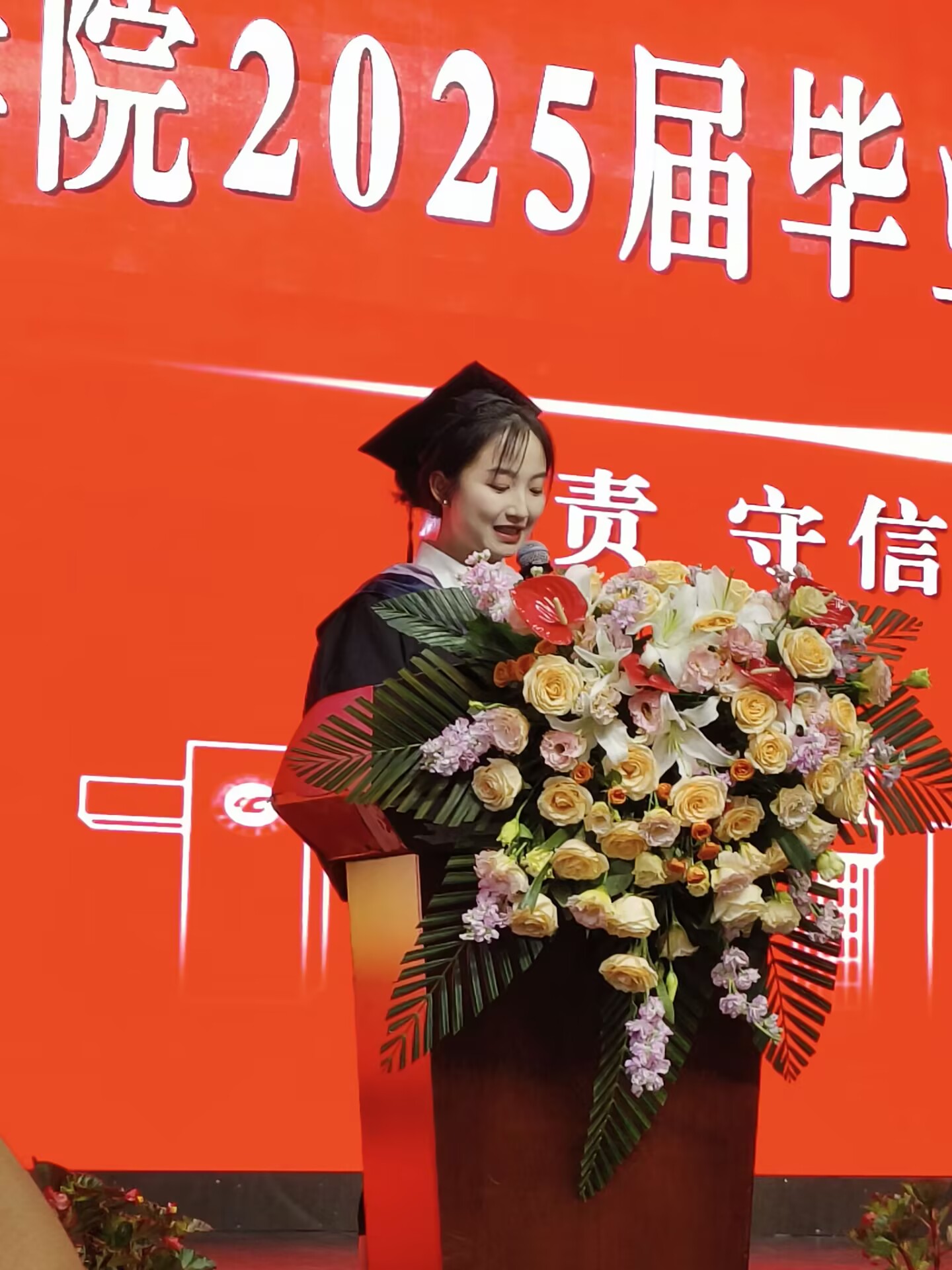 管理学院毕业生代表曾茹妍同学深情回顾了四年求学时光,从军训的英姿飒爽到课堂的求知若渴,从疫情下的线上学习到赛场上的拼搏奋进,点滴记忆勾起了在场师生的共鸣,也表达了对母校培养的感激之情和对未来的美好憧憬。