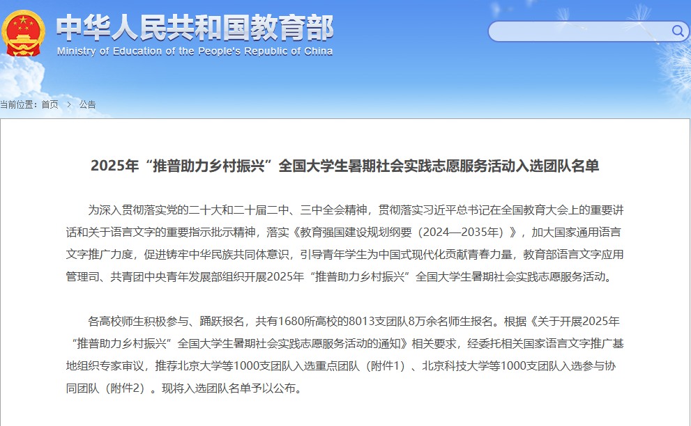 近日,教育部语言文字应用管理司、共青团中央青年发展部组织开展2025年“推普助力乡村振兴”全国大学生暑期社会实践志愿服务活动。我院朱露老师指导的“青年先锋宣讲团”成功入选2025年“推普助力乡村振兴”全国大学生暑期社会实践志愿服务活动协同团队。