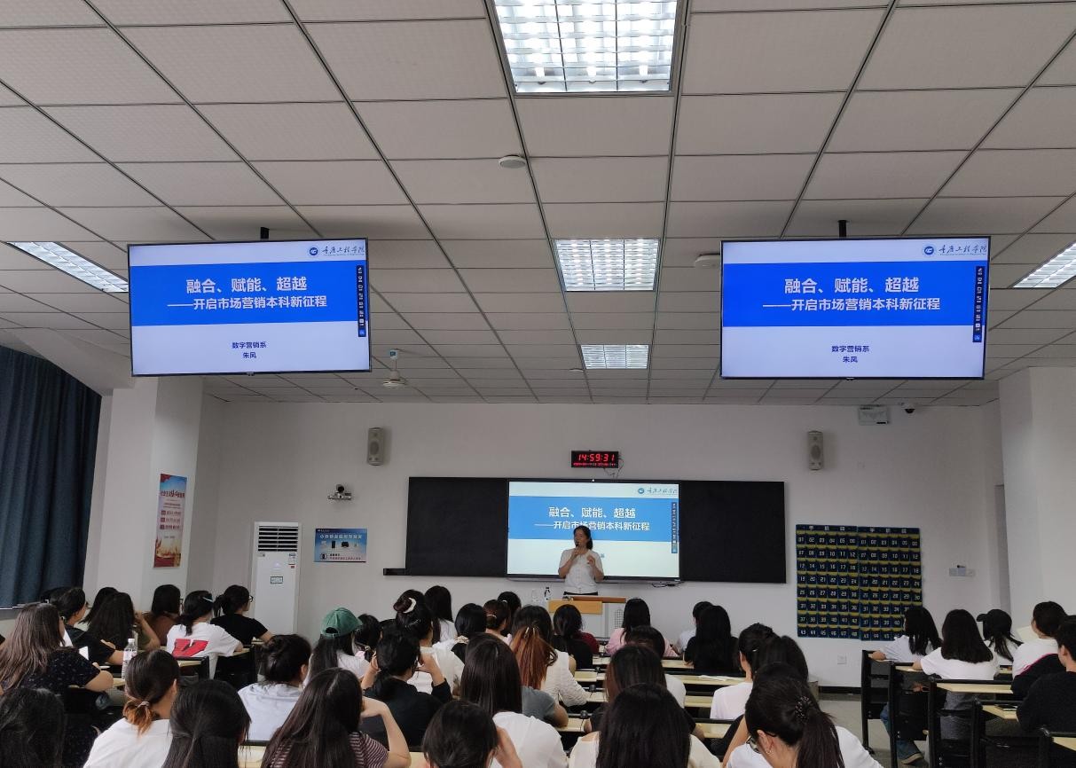 朱凤老师以“融合·赋能超越——开启市场营销本科新征程”为主题,结合当下消费趋势与行业案例,系统讲解了市场营销专业的核心课程与培养目标。她从认识营销、品牌策划、市场调研等关键模块切入,用生动的案例分析了新媒体时代营销的创新模式,并针对学生关心的就业方向,详细介绍了企业营销岗、品牌运营、市场分析等岗位的能力要求,鼓励同学们培养“以消费者为中心”的思维,提升沟通与数据分析能力。