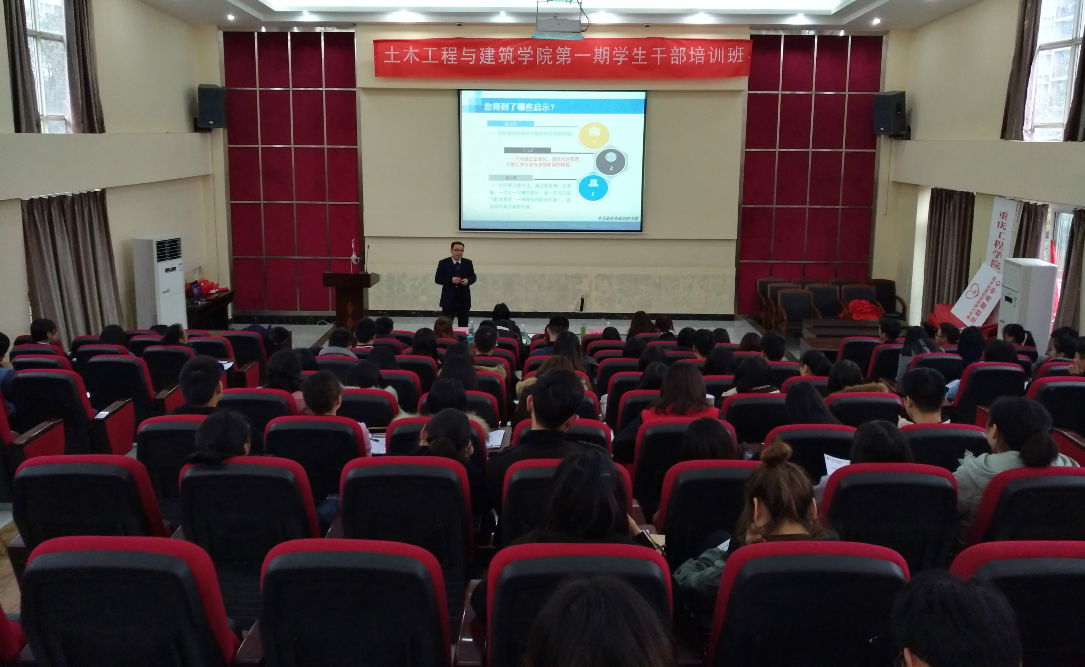 本网讯(图/文 吕威江)为进一步提升土木学院学生干部综合素质,培养学生自我教育,自我管理,自我提升的能力,更好的推进学生工作的快速发展,我院于2017年3月6日16:00在行政楼阶梯报告厅举行了学院学生干部培训班开班典礼暨干部培训第一节课。出席本次活动的有土木工程与建筑学院院长雷江、党委书记杨晓玉、学工主任兼分团委书记曾谨及指导教师熊碧菲。本次培训由学工主任曾谨老师主持,院长雷江为大家进行第一节课程培训。