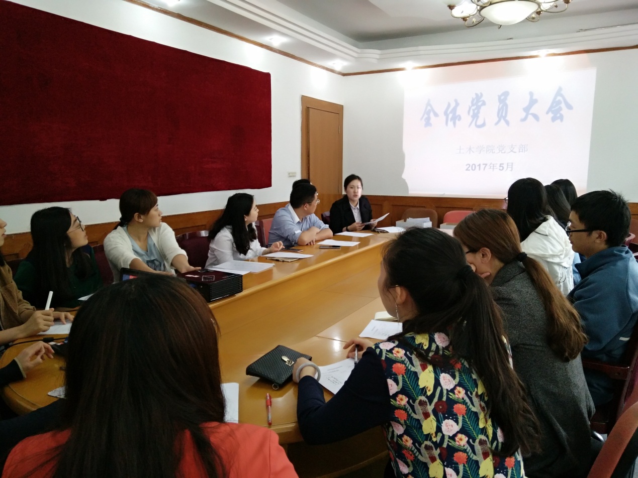 本网讯(文/曾薪文 图/王洪滟)5月8日,土木工程与建筑学院第一次全体党员大会在第一教学楼二楼会议室圆满召开,大会由土木学院党支部书记杨晓玉主持,学院十二名教师党员、一名学生预备党员和五名学生党员发展对象参加了本次会议。