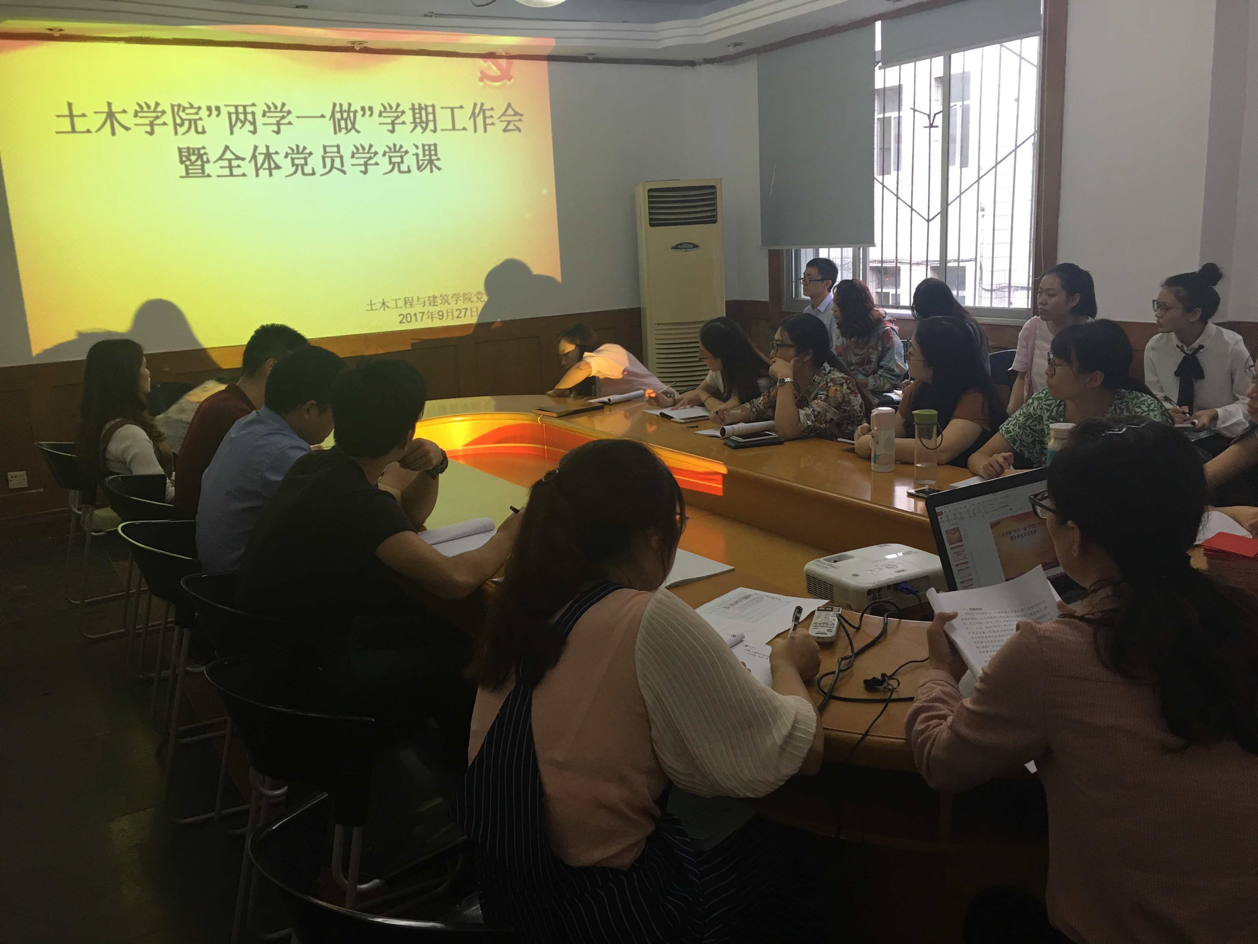 (本网讯 文/图 曾薪文)9月27日,土木学院2017年下半学年“两学一做”学习教育推进会暨全体党员新学期首次党课在一教会议室顺利开展,16名教师党员和7名学生党员同志参加。