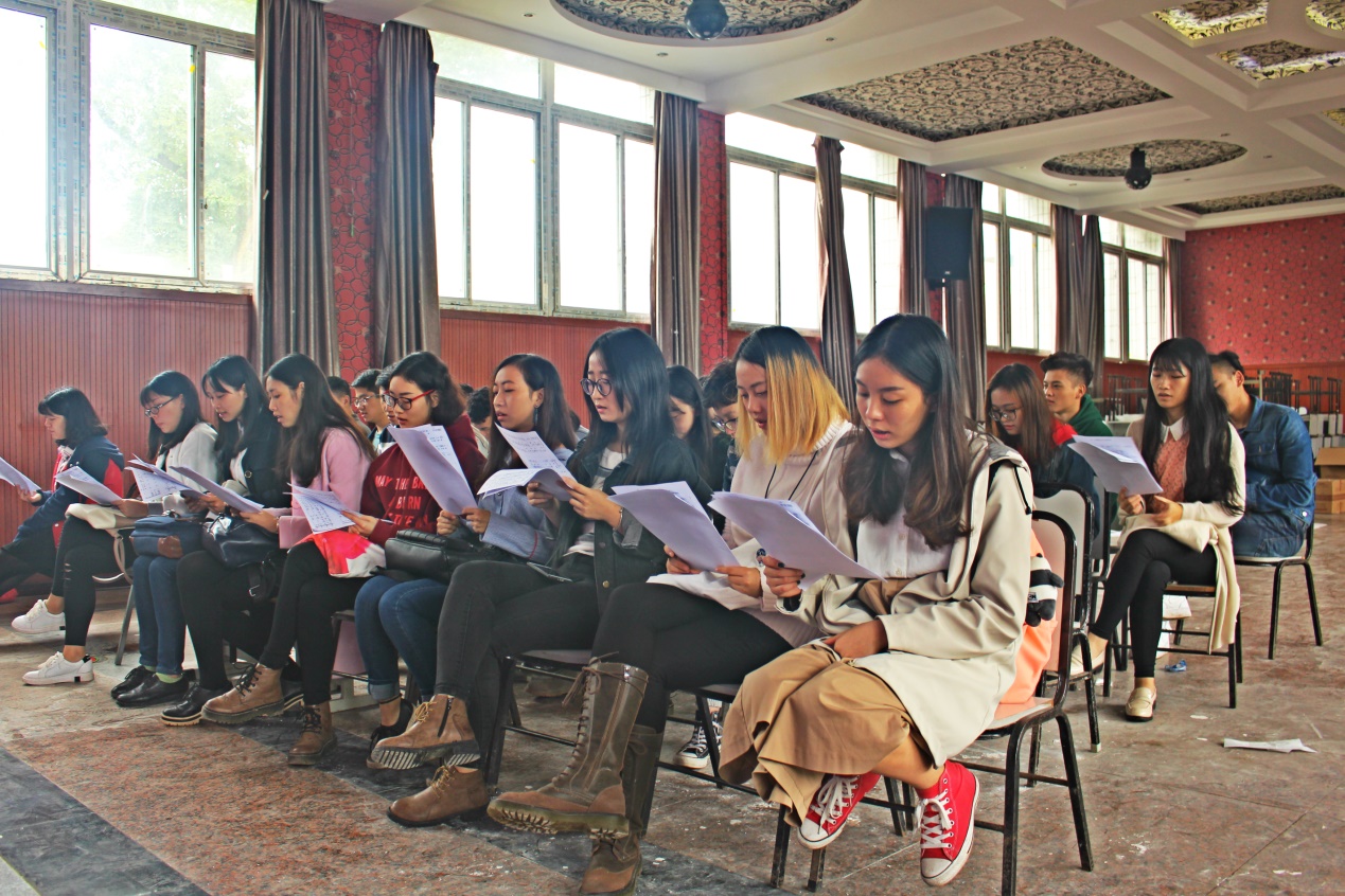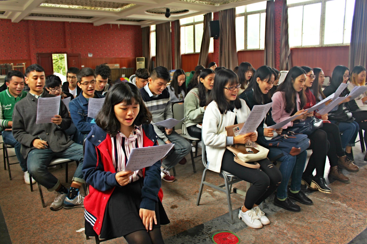 本次合唱队伍由10月初开始筹建,经过筛选,现有54名同学加入,并开始了每周两次的合唱训练。本次排练近两个小时,排练中指导老师揪出同学们几个配合尚不到位的关键部位并对之加以反复练习,同学们积极配合,不断体会,负责人适时加以鼓励,大家热情高涨,唱词更为准确,用尽量短的时间达到了预期的效果。