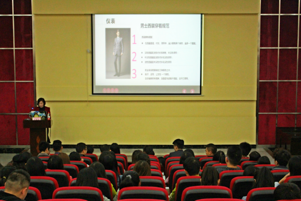 此次培训分两部分,第一部分从角色定位方面强调了作为学生学习的重要性,并提出作为学生干部应该具备的能力;第二部分从仪容仪表、言行举止等方面讲解礼仪素养,强调细节决定成败;最后,邹教授采取实践教学的模式与学生互动,正确示范站姿坐姿的礼仪。