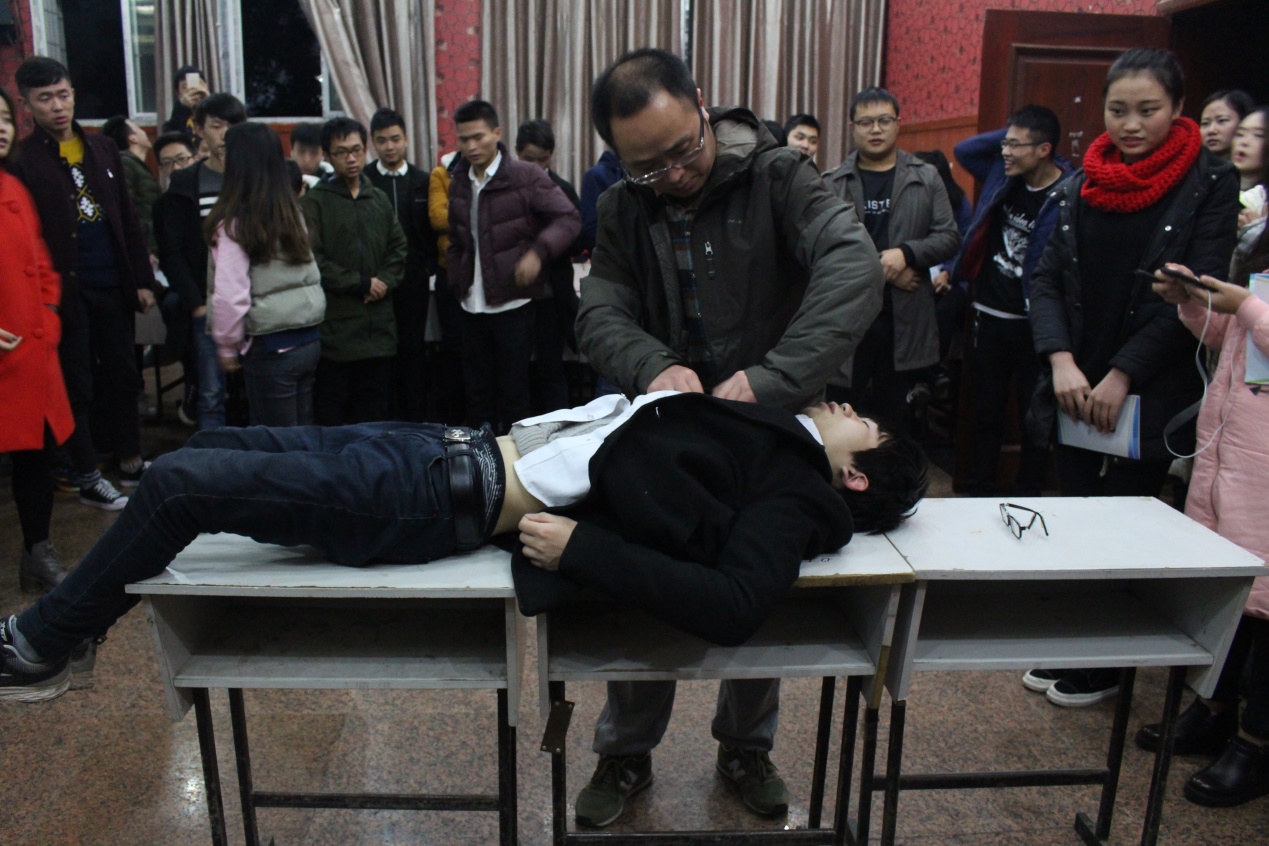本次讲座特邀重庆市急救医疗中心急救部教学主任、主治医师石磊老师为同学们进行急救知识培训。石老师从基础生命支持BLS,常见急症现场急救,传染病认识,现场创伤救护四个方面为同学们进行讲解。培训过程中,现场突然有同学晕倒,石老师采用现场教学的形式提醒大家在这种情况下不能围住患者,应保持空气流通,并详细指导应如何救治受伤人员,让大家现场体验如何正确实施急救。