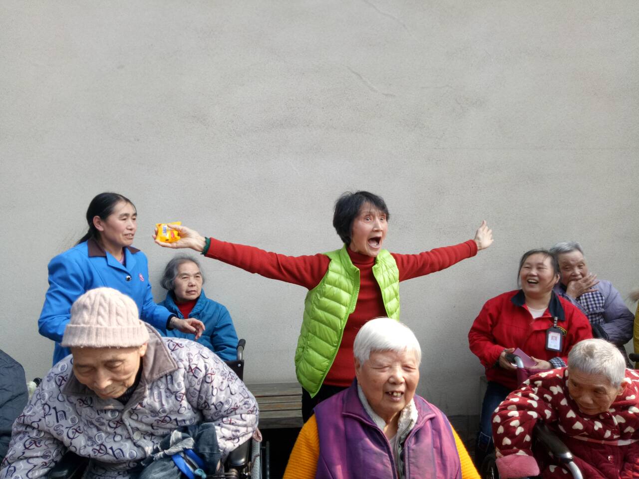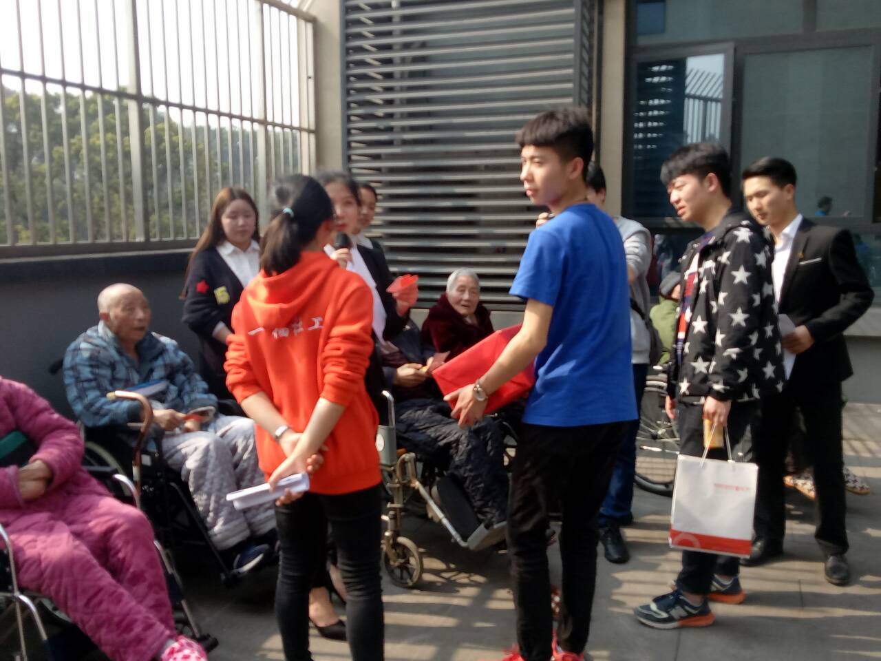 此次活动主要面向福利院六区的所有老人,共40余名。活动采用汇演形式,分为节目演出、抽奖、游戏三个环节,形式包括合唱、朗诵、手语操等。合唱曲目均为经典歌曲,如《敢问路在何方》、《最炫民族风》、《学习雷锋好榜样》等。在抽奖环节和游戏中,活动气氛十分热烈,老人们精气神十足。活动结束后,许多老人都表示此次活动确实给他们平淡的生活带来了一抹阳光!