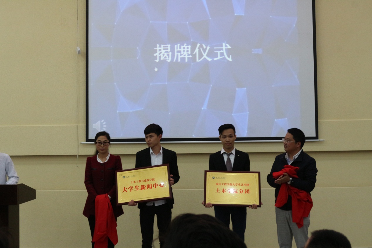 程校长对土木学院大力鼓励学生参与学院的做法表示赞同,希望团体成员们苦练内功,打造独有品牌,成为学校示范团队。学院执行院长雷江希望两个团体的学生能积极参与学院活动,尤其能在宣传工作中发挥所长。学院党总支书记杨晓玉和副院长汪金能为新闻中心及艺术团揭牌。新闻中心全体记者庄严宣誓并佩戴了记者证。艺术团成员带来的合唱《飞翔吧,火凤凰》将现场气氛推向高潮。