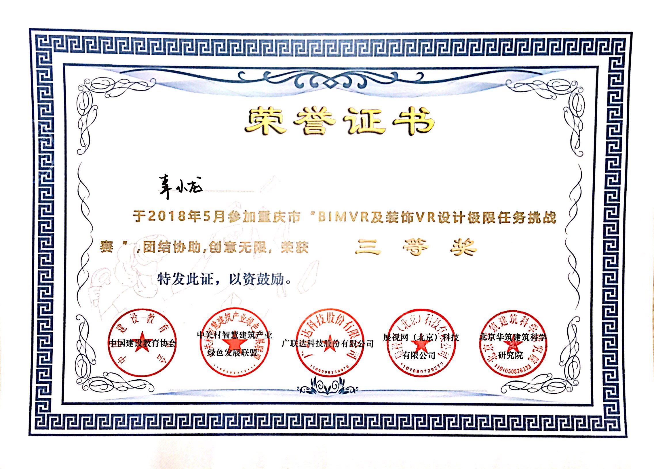本网讯(文\图 毛云莹)5月10日,重庆市BIMVR(建筑信息模型和虚拟现实结合起来的一种技术手段)及装饰VR设计极限任务挑战赛在重庆工商职业学院正式开赛。土木学院工程造价专业2016级学生罗文武、辜小龙、黄洪友组队参加了比赛并荣获团队三等奖。