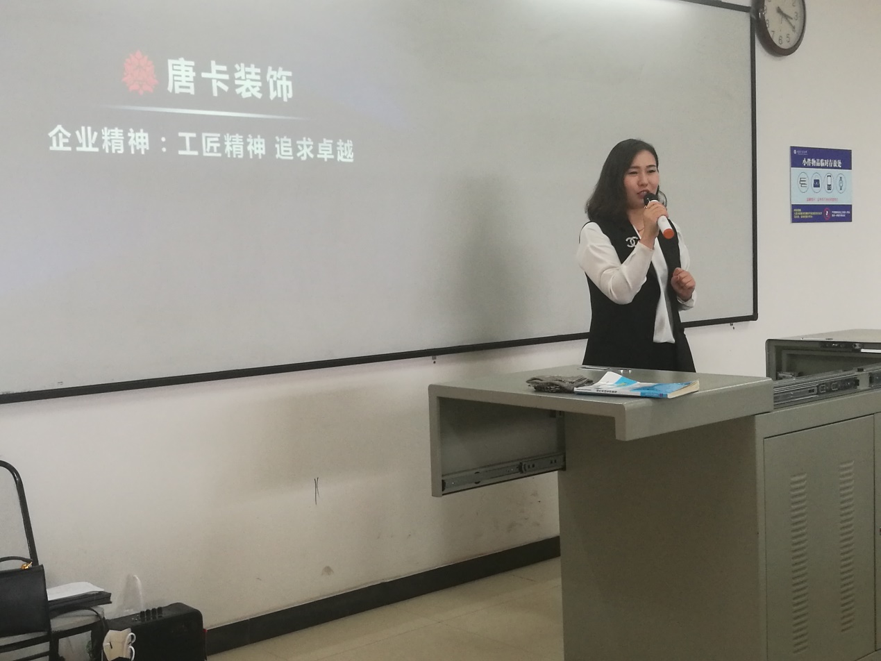 艺百年装饰运营总监屈小雅为大家简单介绍了唐卡公司的基本情况、经营规模、几位高级设计师的概况并分享了公司的许多优秀作品。之后还我们讲述了我校一名毕业生的职业发展历程,以此鼓励同学们努力奋斗,相信成功的方法就是努力。会后,毕业生纷纷表达了自己的就业意向,屈总也表示将会为同学提供更多更好的锻炼机会。