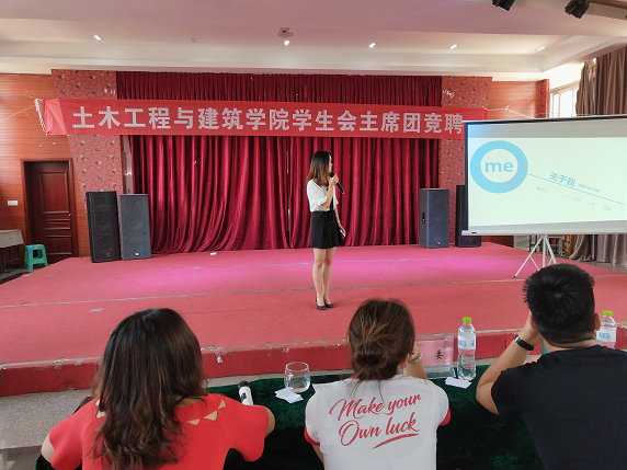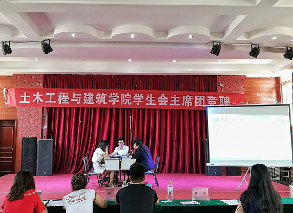本网讯(文/于延林,图/黄权举)2018年6月6日下午13点30分,土木学院团委学生会主席团竞聘大会在土木学院三楼多功能报告厅举行。经过演讲、评委提问、无领导小组讨论等环节,最终确定学生会主席为冯雨婷,副主席为周代玖、熊书樱,新闻中心主任为李兴玉。
