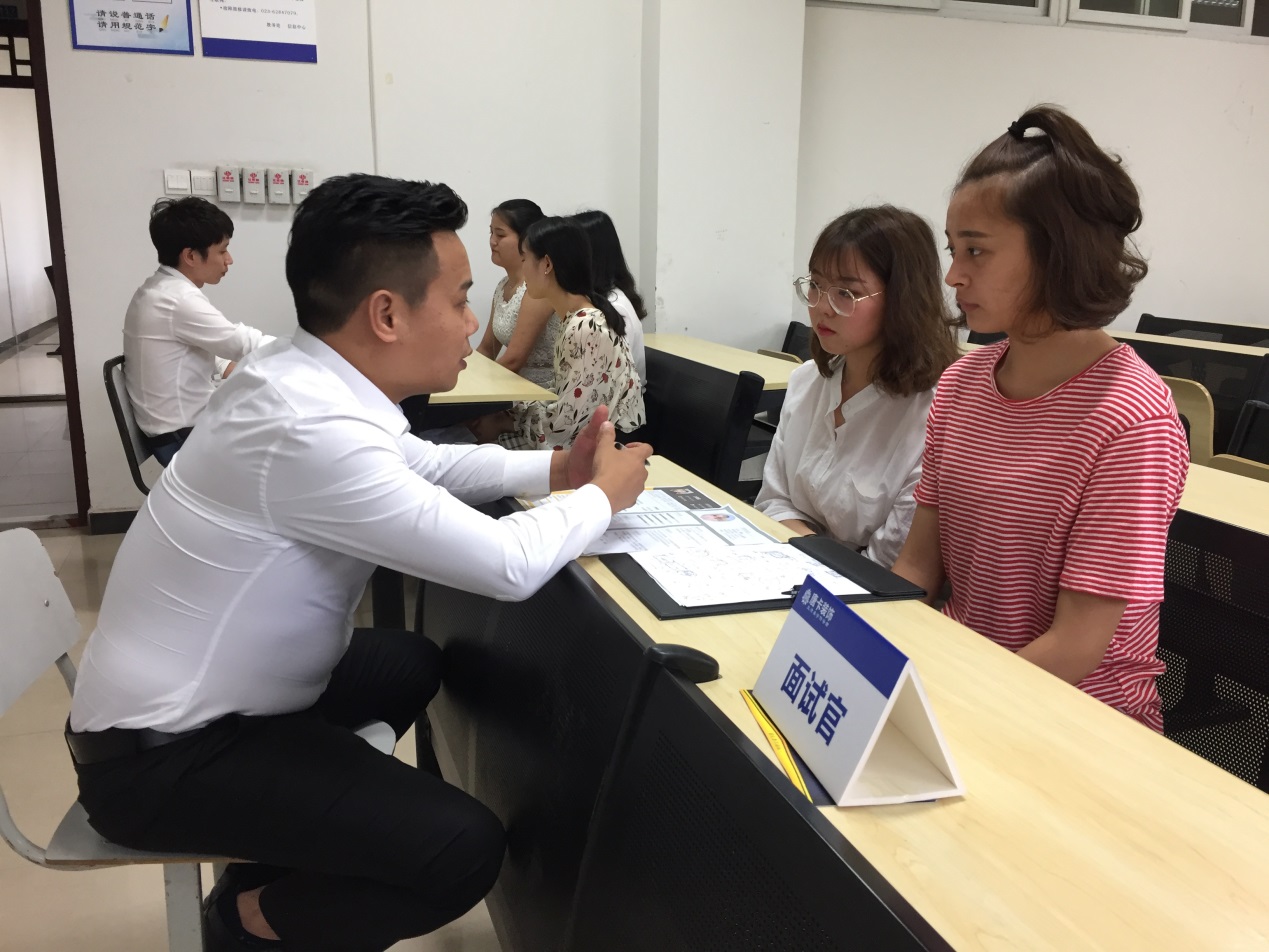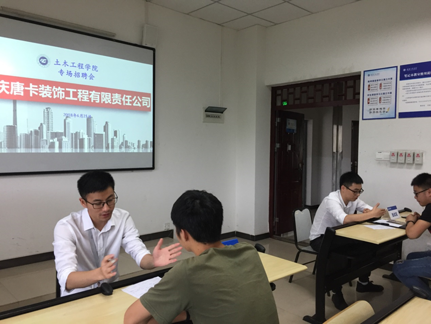 本网讯(文/图 肖思)2018年6月21日下午14点,土木学院在六教112、113教室举行重庆唐卡装饰工程有限责任公司(下称“唐卡公司”)专场招聘会。唐卡公司人力行政部经理陈玲玲等8人担任面试官。