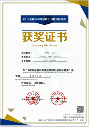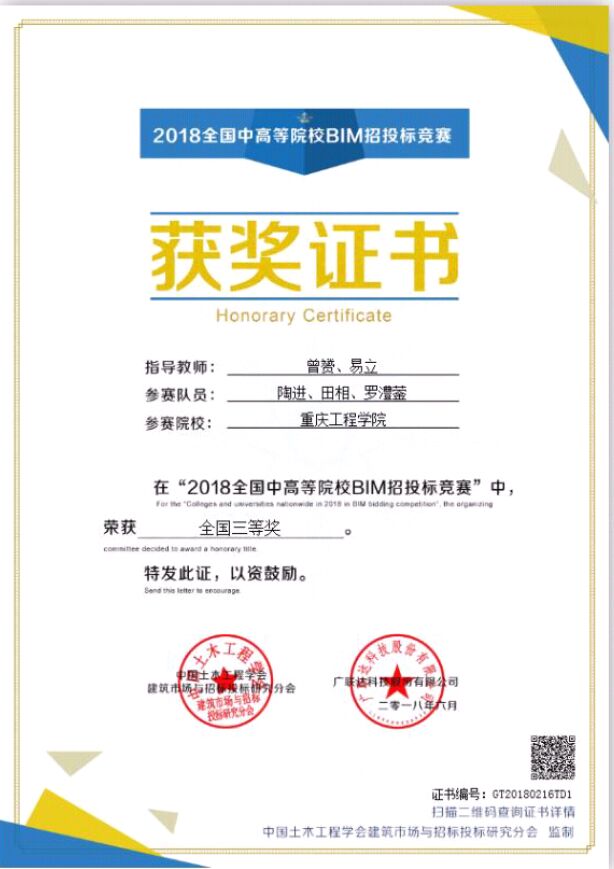 本网讯(文/图 曾赟)2018年6月14日,历时3个月的“2018全国中高等院校BIM招投标网络竞赛”圆满落幕。土木工程学院2015级工程造价专业两个参赛队伍在比赛中表现优异,由曾赟、易立老师指导的陶进、罗澧蓥、田相同学组成的“黄埔工造小分队”;何若岚、但琳凤、田婷同学组成的“三人行”队同获全国三等奖。