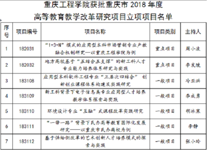 重庆市教委近日下发专门通知,公布全市2018年度高等教育教学改革研究项目立项名单。土木学院胡冰寒老师的《环境设计专业“互融”式课程改革实践研究》成功获批一般项目,其内容涵盖新工科教育人才能力培养体系、教学体系、课程及培养模式改革等高等教育教学改革热点前沿领域。据了解,2018年全市高等教育教学改革研究项目共立项522项,其中重大项目31项、重点项目125项、一般项目366项。