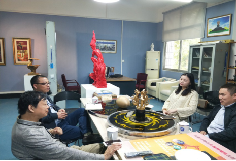 学院执行院长雷江向陈能雄总监介绍了火凤凰文化产业研究中心在产教结合、应用型人才培养等方面的基本情况和中心的发展规划。蔡跃宏老师详细介绍了“火凤凰”的发展历程,文化内涵和文创产品。