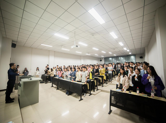 首先,俞老师抛出一个大的问题——什么是演讲?以此充分调动同学们的兴趣。俞老师指出演讲包含文字内容、有声内容、无声内容这三要素,其中无声内容和有声内容在演讲过程中能给人以最深刻的印象。随后,俞老师给同学们介绍了演讲的常用手势,并传授给同学们克服演讲紧张心理的一些小技巧,例如手势转移紧张、台前定位、七秒控场、鞠躬致敬、眼神交流互动等。最后,俞老师邀请几位同学上台来进行演示并亲自进行示范,伴随着朗诵背景音乐的播放,同学们与俞老师一起合作朗诵了一首抒情诗。在经久不息的掌声中,本次讲座圆满结束。