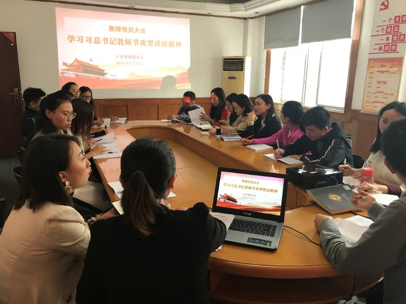 通过学习习近平总书记在教师节重要讲话精神,全体党员教师一致认为,青年教师在高等教育中扮演着重要角色,发挥着重要作用,一定要珍惜“老师”这个称呼,做有道德、有理想、有知识、有仁爱之心的学生的引路人,要强化学生的专业意识,对学生加强专业训练,使学生树立强烈的专业自信,注重长期的沉淀和积累,同时要协调好主客观各个方面的因素,促进土木学院的发展。