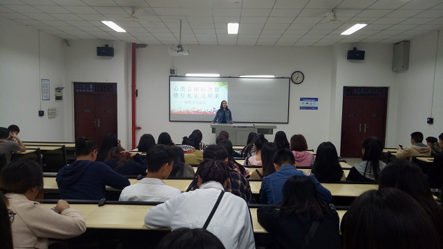 本网讯(图/文 林丽)10月7日18:30,2017级室内艺术设计1-2班在第六教学楼301教室开展“心美言丽宿舍留,德行礼让文明求”主题班会。