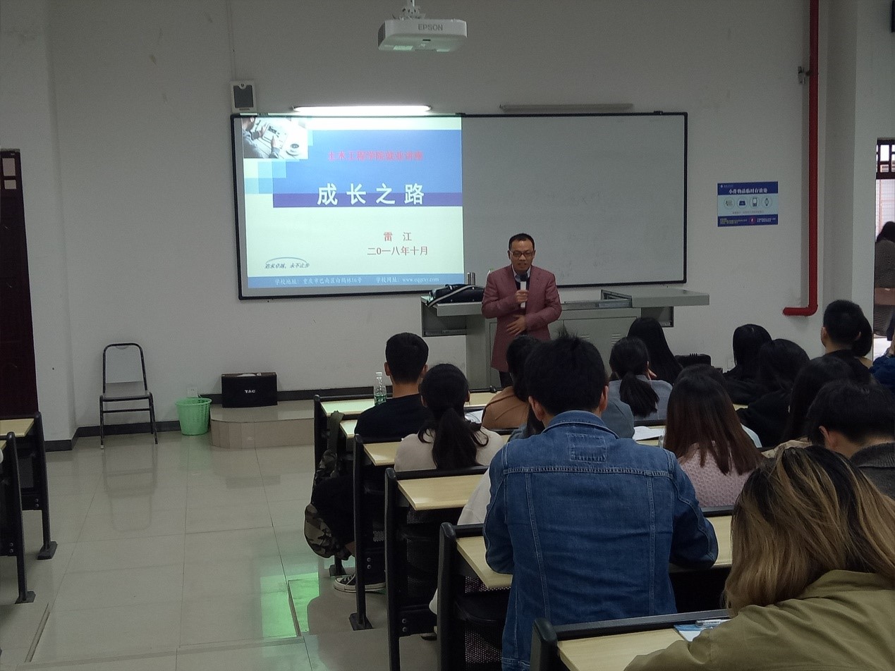 (本网讯 文/陈培 图/李科)为进一步提升土木工程学院学生综合素质,引导学生未来良好就业,10月24日下午4时,土木学院在六教204开展就业指导讲座,由院长雷江主讲。