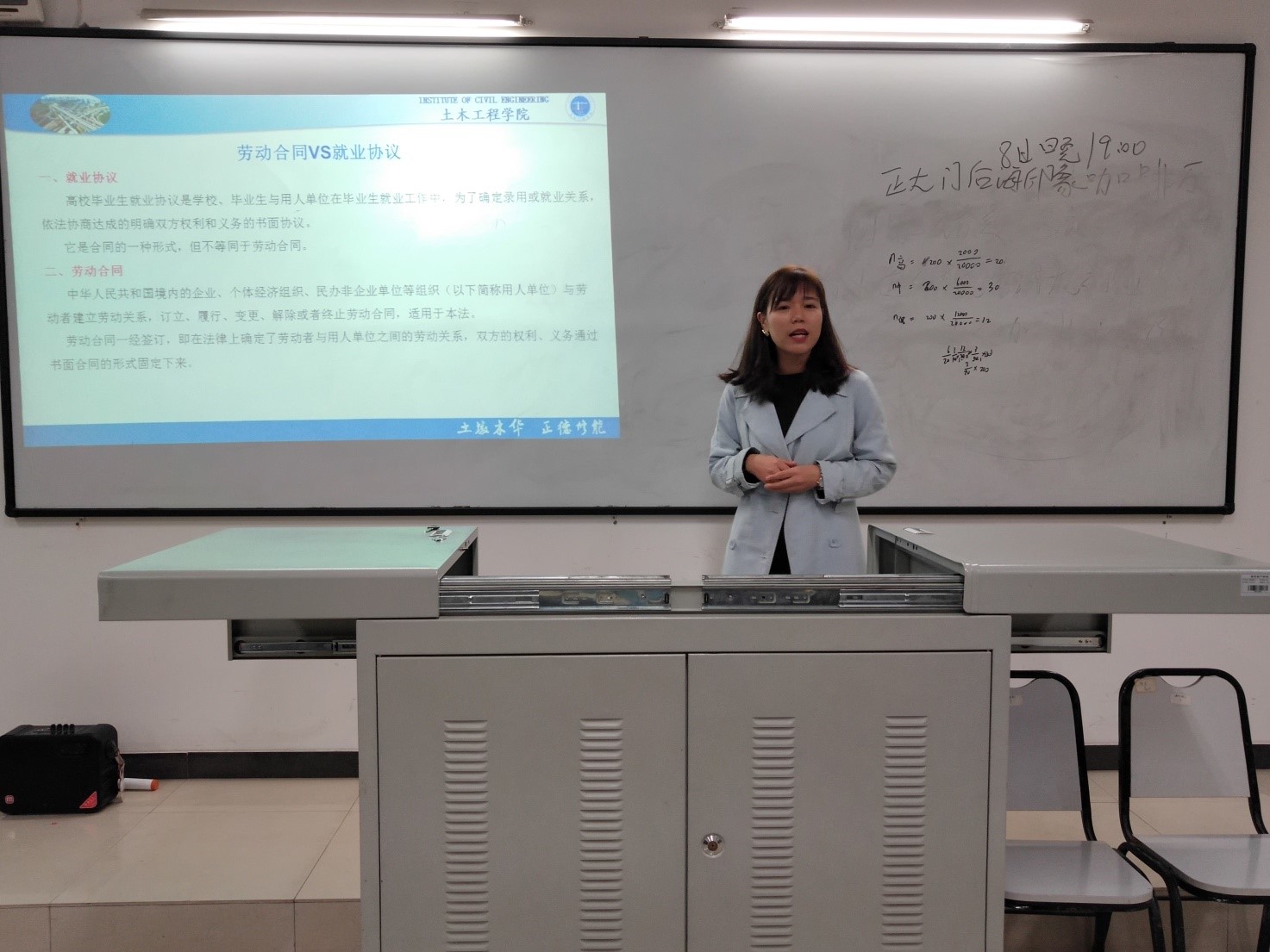 本网讯(文/刘蕾 图/李兴玉)为了让同学们提前了解就业政策,及时把握就业机会,土木学院于2018年11月5日18:30在第六教学楼201教室开展“就业政策早知道”就业指导讲座,主讲人为16级工程造价专业辅导员向丽虹。