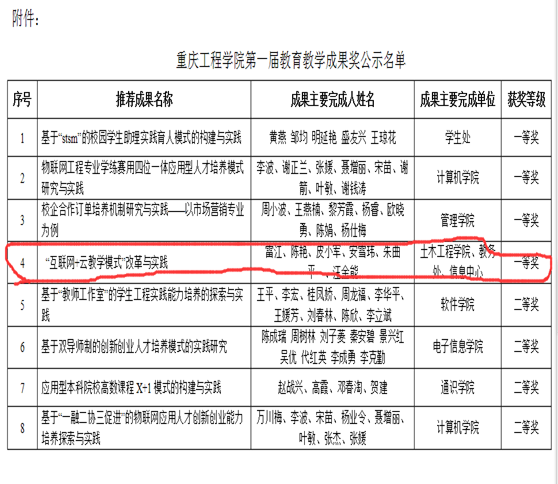 本网讯(文、图/李兴玉)近日,学校公布的第一届教学成果奖获奖名单中,雷江院长牵头完成的教学成果《“互联网+云教学模式”改革与实践》榜上有名,荣获一等奖。