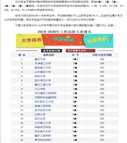本网讯(文/图 华少帅)近日,中国科教评价网发布了《工程造价专业排名—金平果2019年中国大学分专业竞争力排行榜》,土木工程学院“工程造价”专业排在第19位,成功进入全国二十强。